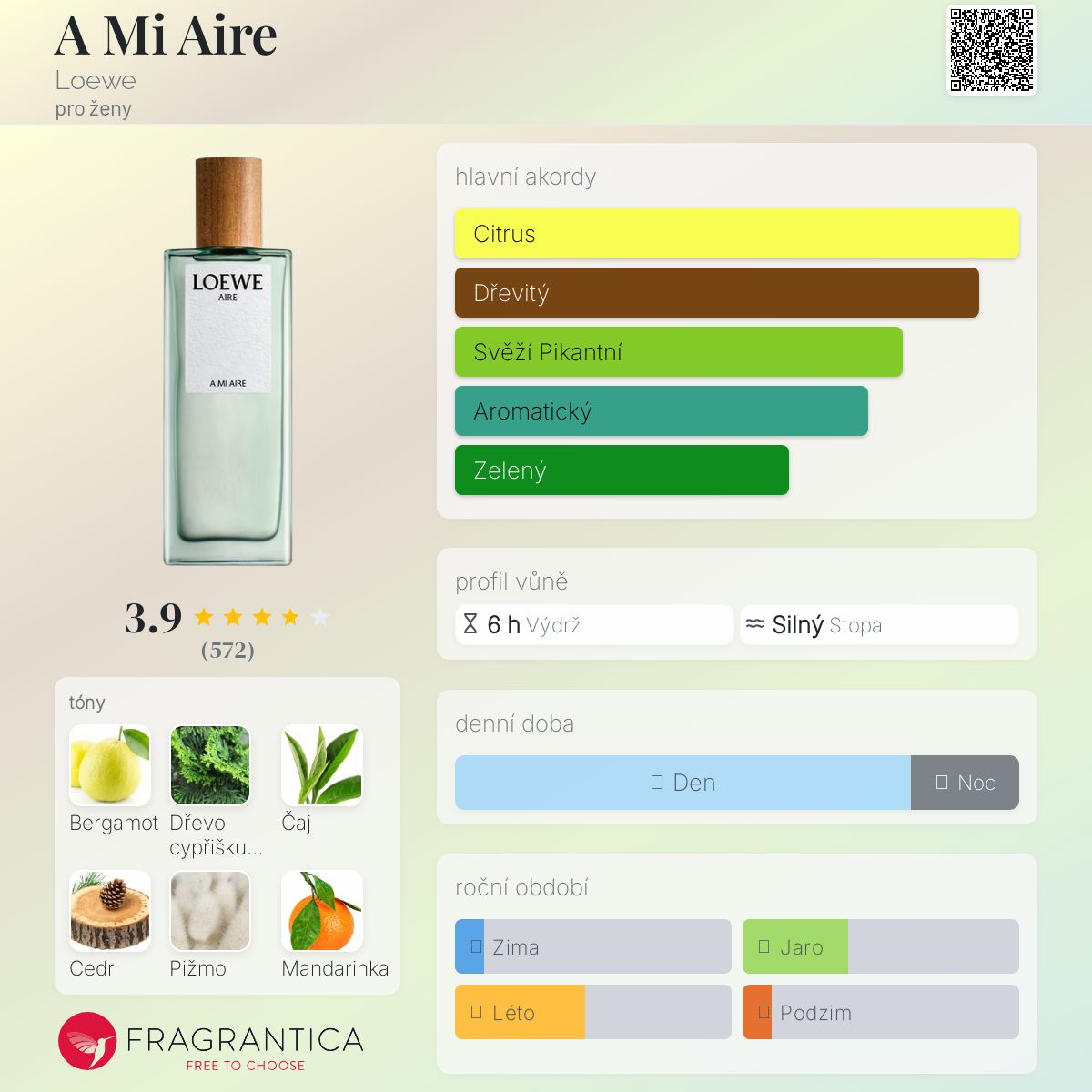 A Mi Aire podle Loewe je Floral Fruity vůně pro ženy. A Mi Aire byl/a uveden/a v roce 2005. A Mi Aire byl/a vytvořen/a Emilio Valeros a Olivier Cresp. Vrchní tóny jsou Bergamot, Mandarinka, Mandarinka a Hřebíček; střední tóny jsouČaj, Jasmín, Růže, Pepř a Karafiát ; základní tóny jsou Dřevo cypřišku tupolistého, Cedr, Pižmo a Mech.