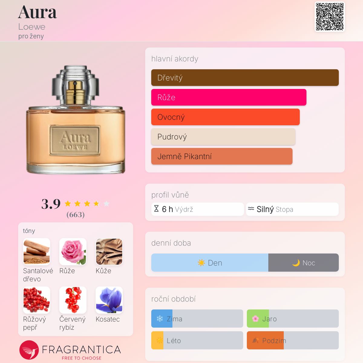 Aura podle Loewe je Orientální Floral vůně pro ženy. Aura byl/a uveden/a v roce 2013. Vrchní tóny jsou Růžový pepř, Červený rybíz, Fialkový list a Bergamot; střední tóny jsouRůže, Kosatec, Jasmín a Narcis ; základní tóny jsou Santalové dřevo, Kůže, Cedr a Maliny.