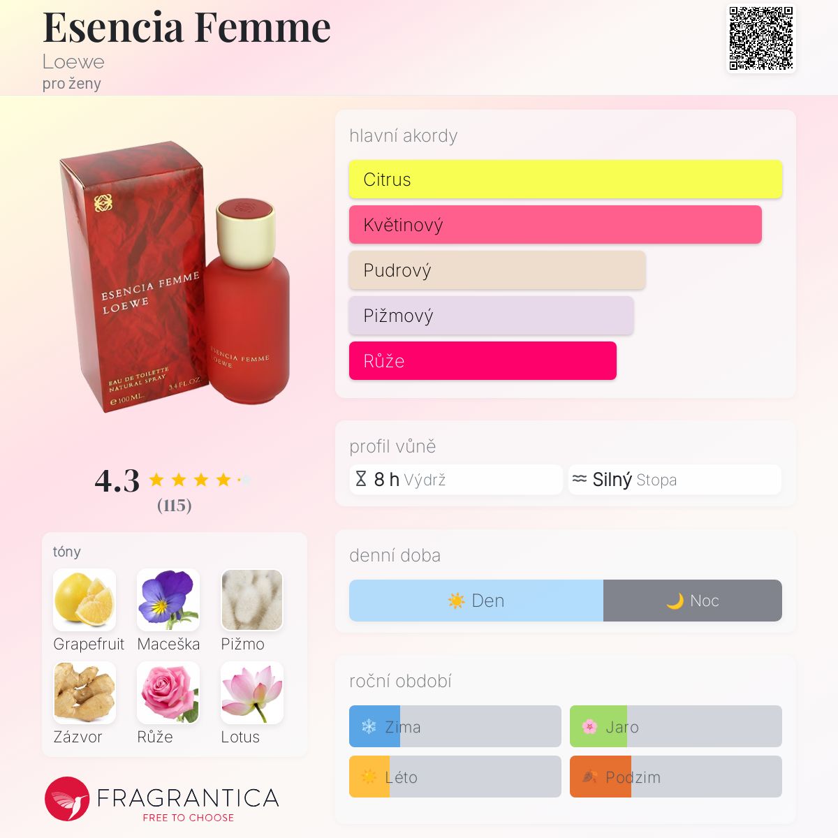 Esencia Femme podle Loewe je Floral vůně pro ženy. Esencia Femme byl/a uveden/a v roce 2002. Esencia Femme byl/a vytvořen/a Alberto Morillas a Emilio Valeros. Vrchní tóny jsou Grapefruit, Zázvor, Bergamot a Citrón; střední tóny jsouMaceška, Růže, Lotus a Konvalinka ; základní tóny jsou Pižmo, Růže a Dřevité tóny.