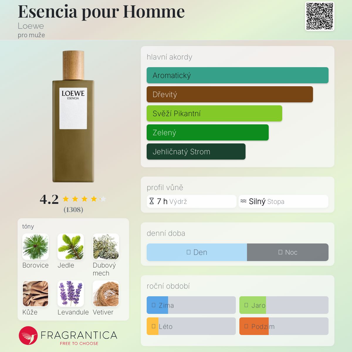 Esencia pour Homme podle Loewe je Aromatic Fougere vůně pro muže. Esencia pour Homme byl/a uveden/a v roce 1988. "Nosem" za touto vůní je Olivier Cresp. Vrchní tóny jsou Levandule, Zelené tóny, Jalovcové bobulky, Bergamot, Estragon, Citrón, Galbanum, Pelyněk a Petitgrain; střední tóny jsouJehličí borovice, Bazalka, Šalvěj muškátová, Pelargónie, Muškátový oříšek, Neroli, Růže, Jasmín, Černý rybíz a Konvalinka ; základní tóny jsou Jedle, Dubový mech, Kůže, Vetiver, Styrax, Cedr, Pačuli, Santalové dřevo, Pižmo, Jantar (ambra) a Fazole tonka.