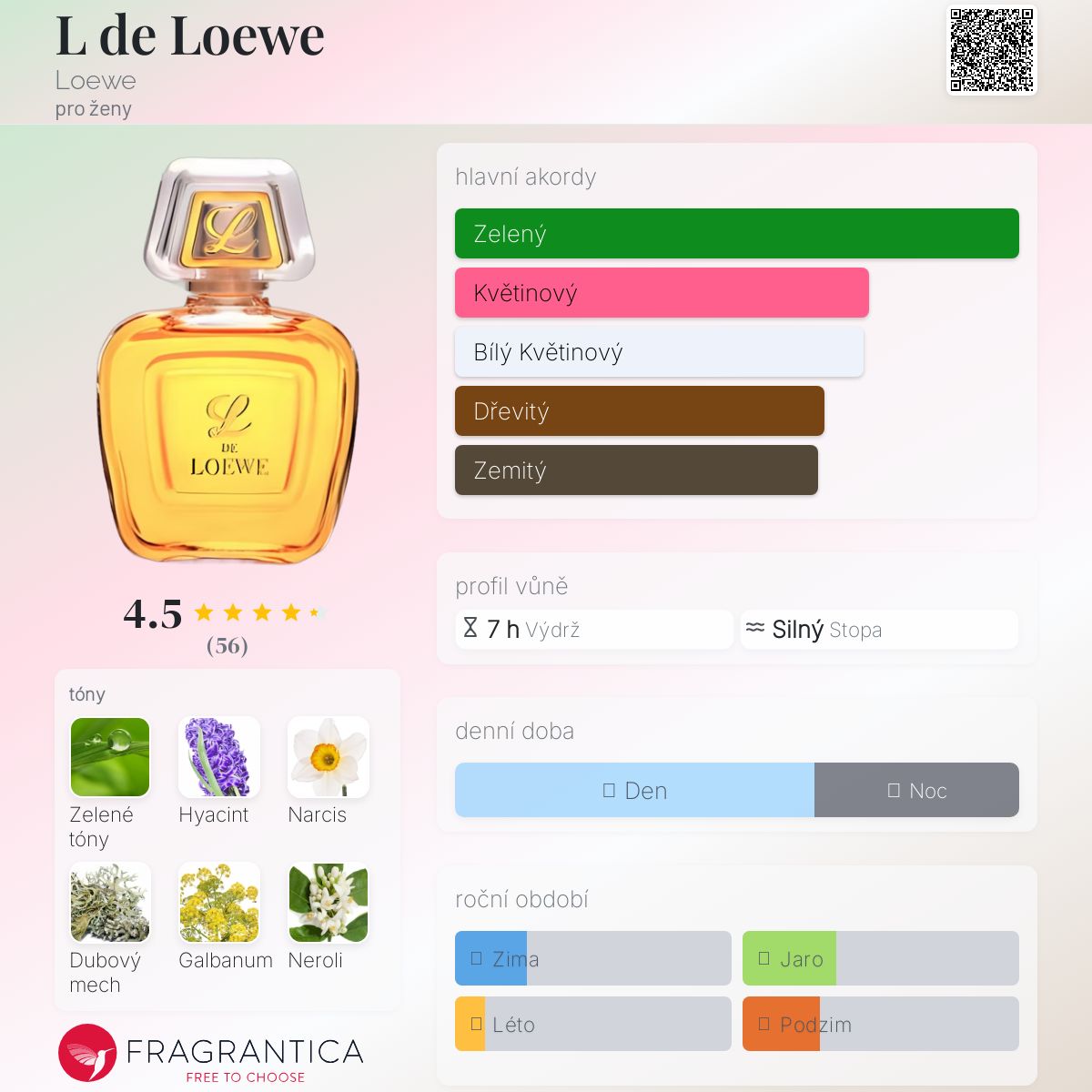 L de Loewe podle Loewe je Chypre Floral vůně pro ženy. L de Loewe byl/a uveden/a v roce 1972. Vrchní tóny jsou Zelený tón, Galbanum, Neroli a Bergamot; střední tóny jsouHyacint, Narcis, Konvalinka, Lilie, Růže, Kosatec a Magnólie ; základní tóny jsou Dubový mech, Ruská kůže, Pižmo, Ambra, Santalové dřevo a Vetiver.