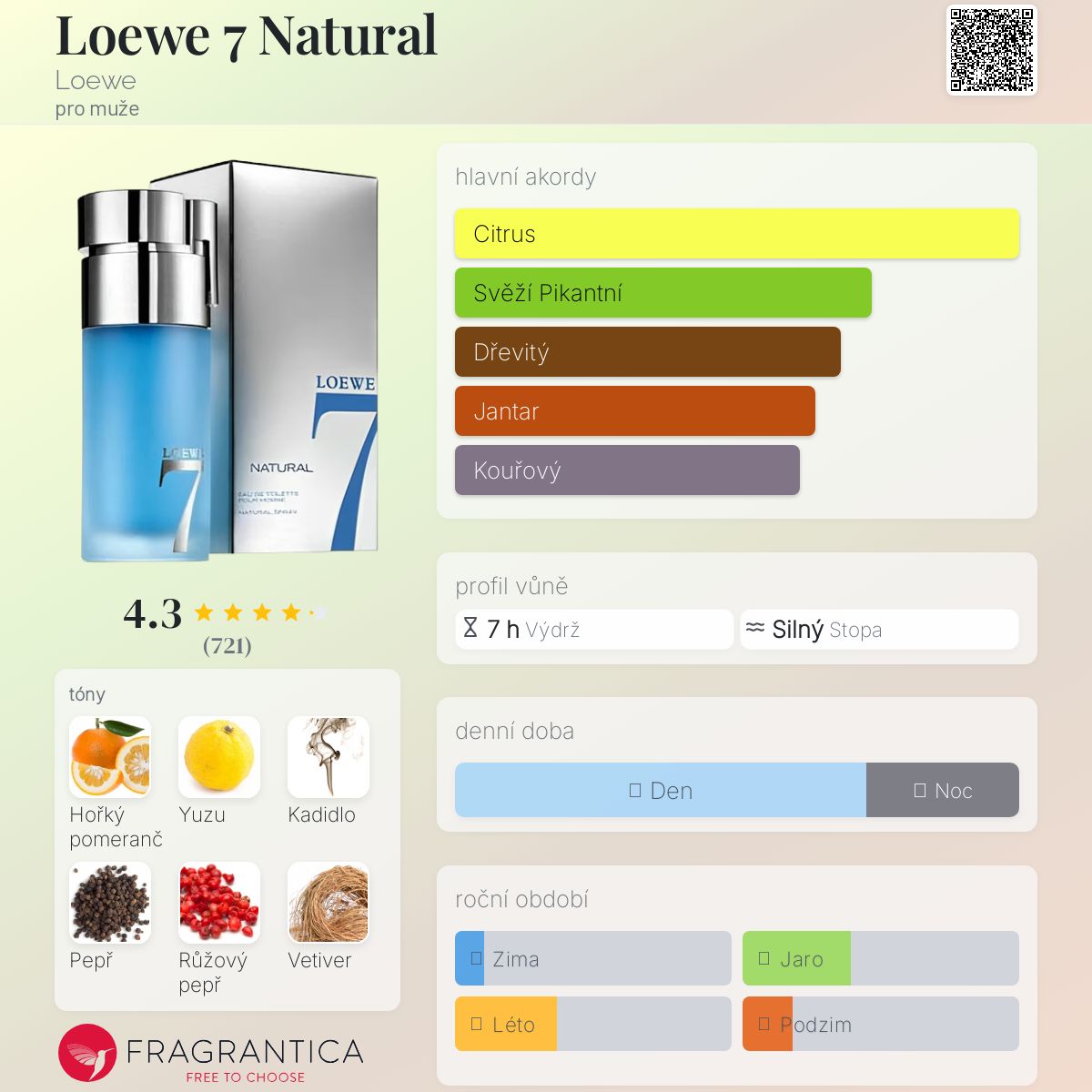 Loewe 7 Natural podle Loewe je Woody Aromatic vůně pro muže. Loewe 7 Natural byl/a uveden/a v roce 2012. Vrchní tóny jsou Hořký pomeranč a Yuzu; střední tóny jsouKadidlo, Pepř a Růžový pepř ; základní tóny jsou Vetiver, Cedr a Pižmo.