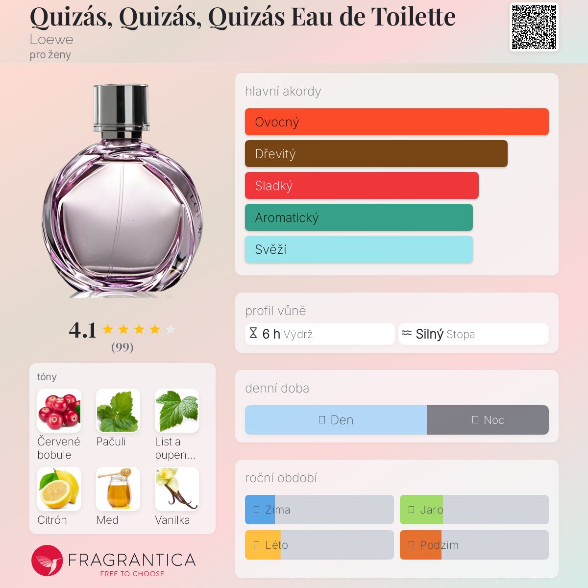 Quizás, Quizás, Quizás Eau de Toilette podle Loewe je Floral vůně pro ženy. Quizás, Quizás, Quizás Eau de Toilette byl/a uveden/a v roce 2007. Quizás, Quizás, Quizás Eau de Toilette byl/a vytvořen/a Carlos Benaïm a Emilio Valeros. Vrchní tóny jsou Červené bobule, Kasie a Italský citrón; střední tóny jsouIndický jasmín a Bulharská růže ; základní tóny jsou Pačuli, Med, Vanilka, Jantar (ambra) a Santalové dřevo.