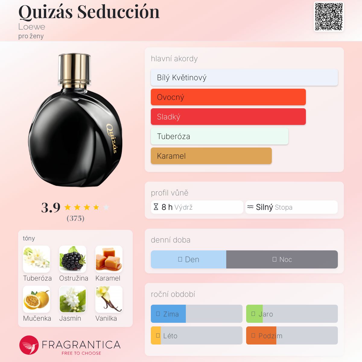 Quizás Seducción podle Loewe je Floral Fruity vůně pro ženy. Quizás Seducción byl/a uveden/a v roce 2014. Vrchní tóny jsou Ostružina, Mučenka a Sladký pomeranč; střední tóny jsouTuberóza, Jasmín Sambac a Pomerančový květ ; základní tóny jsou Karamel a Vanilka.