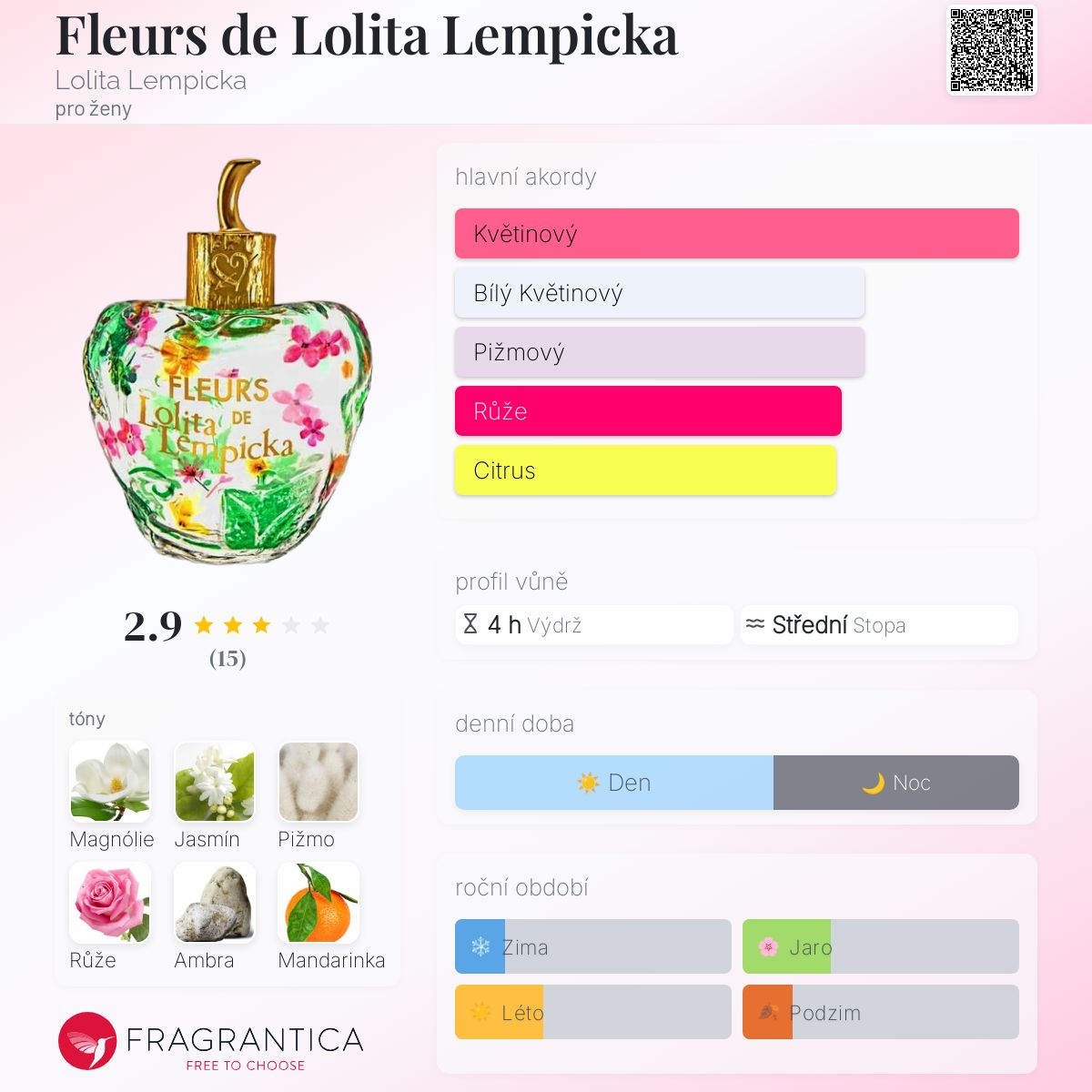 Fleurs de Lolita Lempicka podle Lolita Lempicka je Floral Fruity vůně pro ženy. Toto je nová vůně. Fleurs de Lolita Lempicka byl/a uveden/a v roce 2025. "Nosem" za touto vůní je Ane Ayo. Vrchní tóny jsou Magnólie, Mandarinka a Červené bobule; střední tóny jsouJasmín a Růže ; základní tóny jsou Pižmo, Ambra a Pačuli.