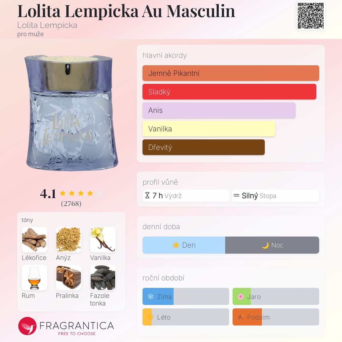 Lolita Lempicka Au Masculin podle Lolita Lempicka je Orientální Vanilla vůně pro muže. Lolita Lempicka Au Masculin byl/a uveden/a v roce 2000. "Nosem" za touto vůní je Annick Menardo. Vrchní tóny jsou Lékořice, Anýz, Fialka, Břečťan, Pelyněk a Bazalka; střední tóny jsouRum, Fazole tonka, Mandle a Santalové dřevo ; základní tóny jsou Vanilka, Pralinka, Vetiver, Cedr a Labdanum.