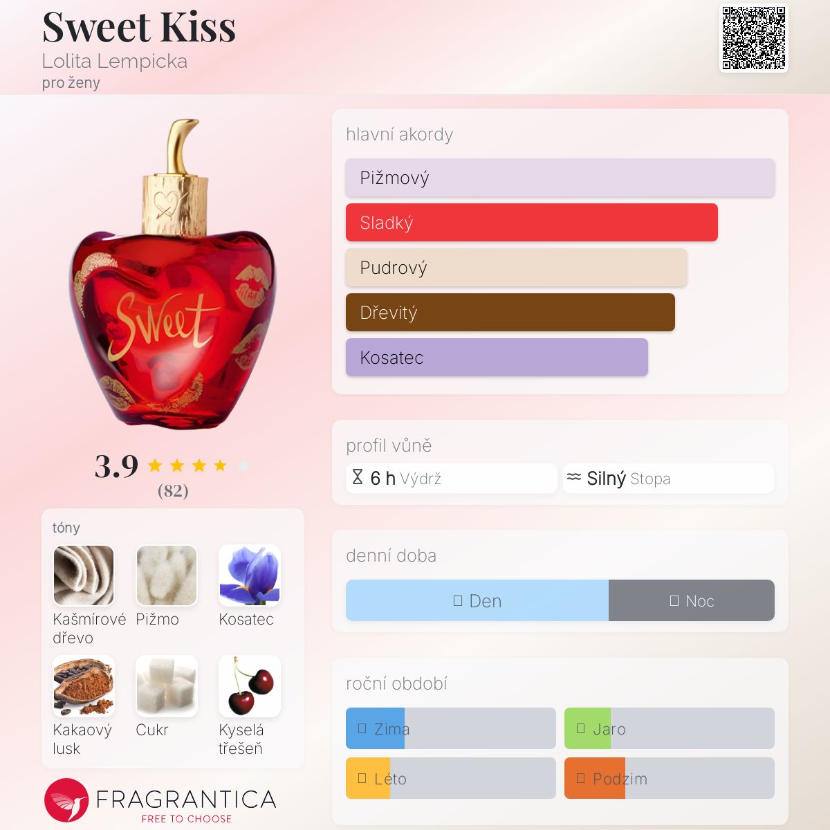 Sweet Kiss podle Lolita Lempicka je Floral Fruity Gourmand vůně pro ženy. Sweet Kiss byl/a uveden/a v roce 2016. "Nosem" za touto vůní je Anne Flipo. Vrchní tóny jsou Cukr a Kyselá třešeň; střední tóny jsouKvět kosatce, Kakao a Andělika ; základní tóny jsou Kašmírové dřevo a Pižmo.