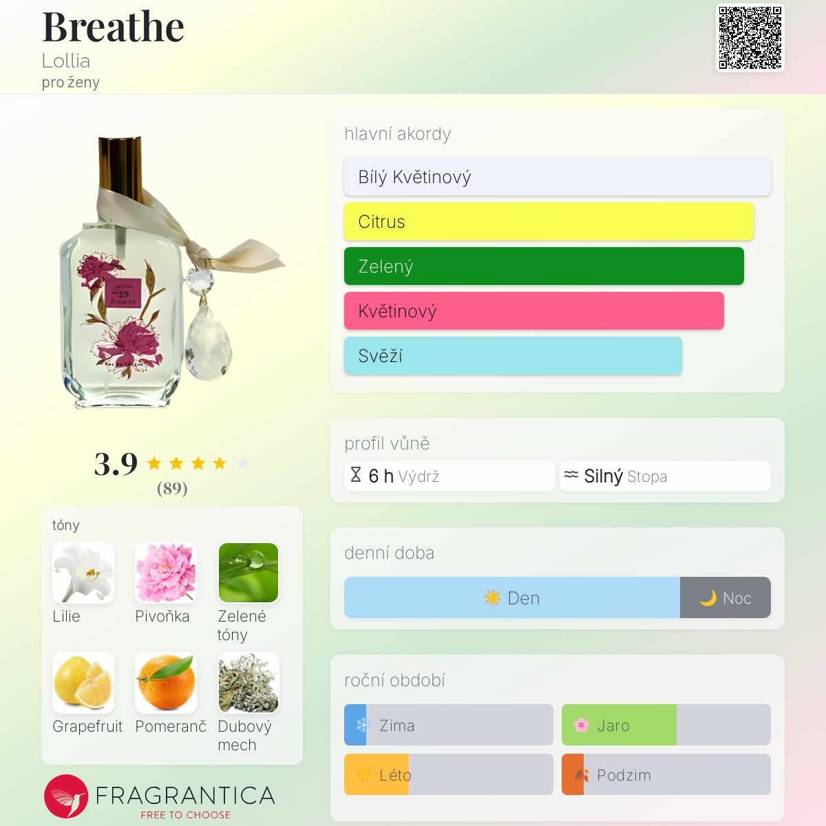 Breathe podle Lollia je Floral Green vůně pro ženy. Breathe byl/a uveden/a v roce 2008. "Nosem" za touto vůní je Margot Elena.