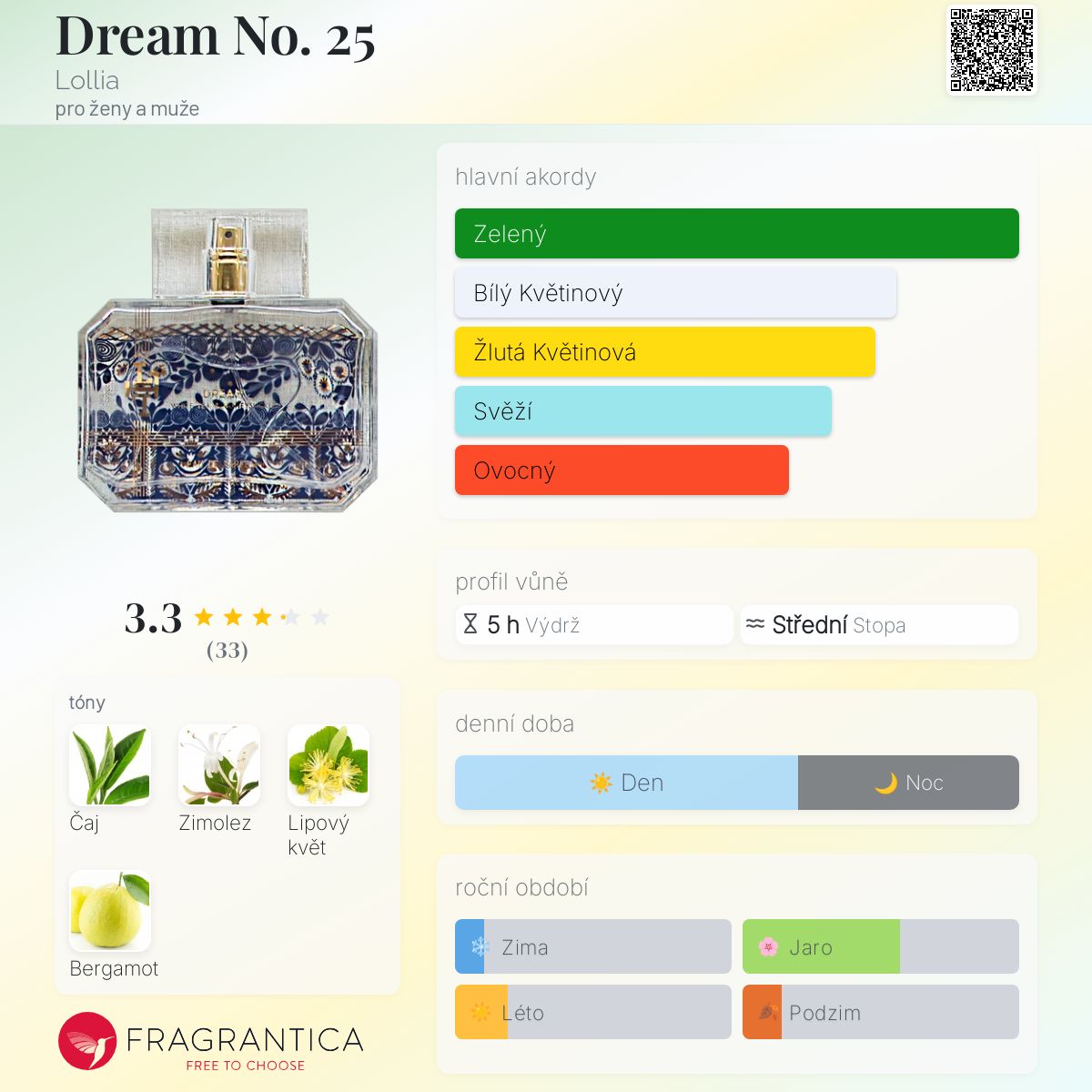Dream No. 25 podle Lollia je Floral vůně pro ženy a muže. Dream No. 25 byl/a uveden/a v roce 2016. "Nosem" za touto vůní je Margot Elena.