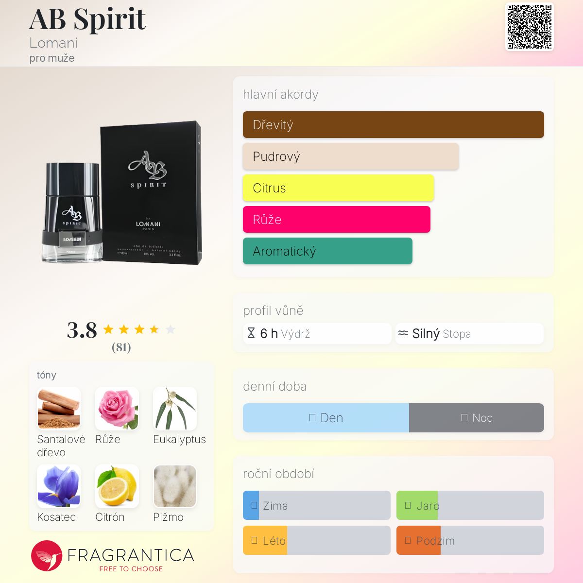 AB Spirit podle Lomani je Woody Floral Musk vůně pro muže. Vrchní tóny jsou Citrón a Bergamot; střední tóny jsouRůže, Eukalyptus a Kosatec ; základní tóny jsou Santalové dřevo, Pižmo, Cedr a Mech.
