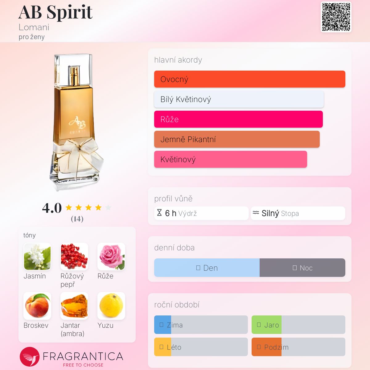 AB Spirit podle Lomani je Chypre Fruity vůně pro ženy. AB Spirit byla spuštěna během 2000. Vrchní tóny jsou Jasmín, Růžový pepř, Yuzu a Černý rybíz; střední tóny jsouRůže, Broskev, Frézie a Lilie ; základní tóny jsou Jantar (ambra), Dubový mech a Pižmo.