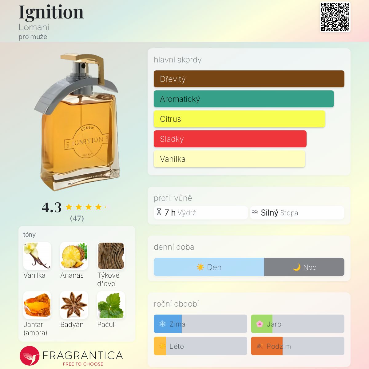 Ignition podle Lomani je Orientální Woody vůně pro muže. Ignition byl/a uveden/a v roce 2001. Vrchní tóny jsou Ananas, Mandarinka, Bergamot, Kardamom a Citrón; střední tóny jsouBadyán, Levandule, Oregano, Pelargónie a Palisandr ; základní tóny jsou Vanilka, Týkové dřevo, Jantar (ambra), Pačuli a Vetiver.
