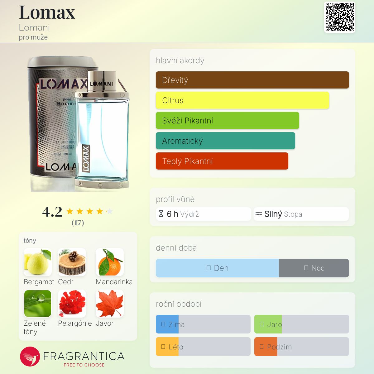 Lomax podle Lomani je Aromatic Spicy vůně pro muže. Vrchní tóny jsou Bergamot, Mandarinka, Zelené tóny a Javor; střední tóny jsouCedr, Pelargónie, Fialka, Kardamom a Hřebíček ; základní tóny jsou Ambra, Pižmo, Pačuli, Santalové dřevo a Mech.
