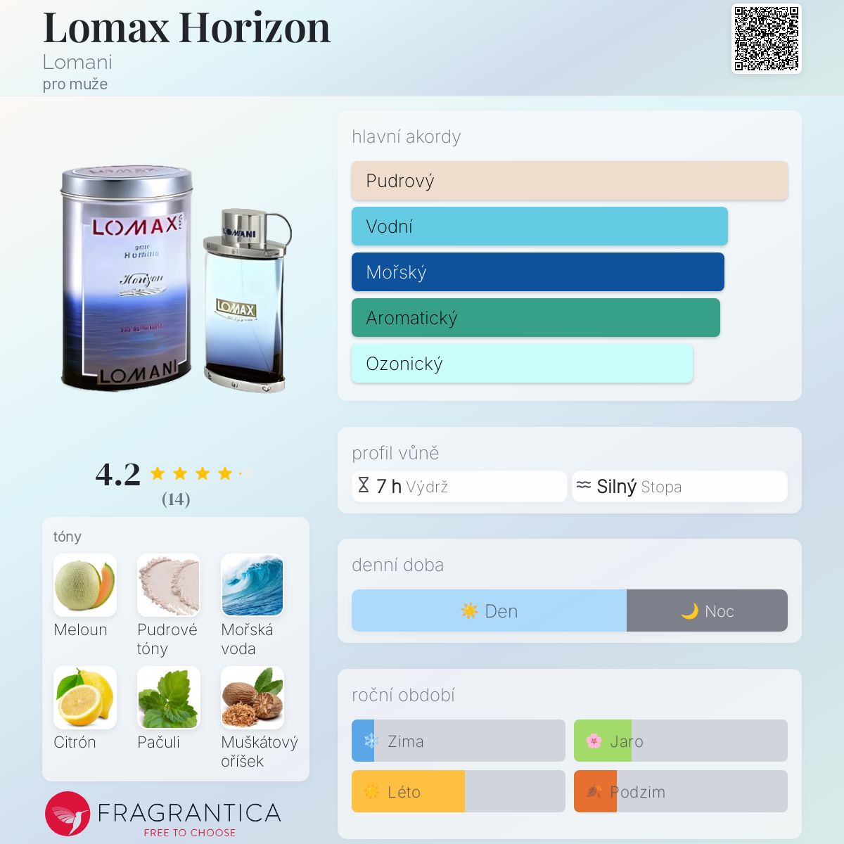 Lomax Horizon podle Lomani je Woody Aquatic vůně pro muže. Vrchní tóny jsou Meloun, Mořské tóny a Citrón; střední tóny jsouPačuli, Muškátový oříšek a Rozmarýn ; základní tóny jsou Pudrové tóny, Dřevité tóny a Pižmo.