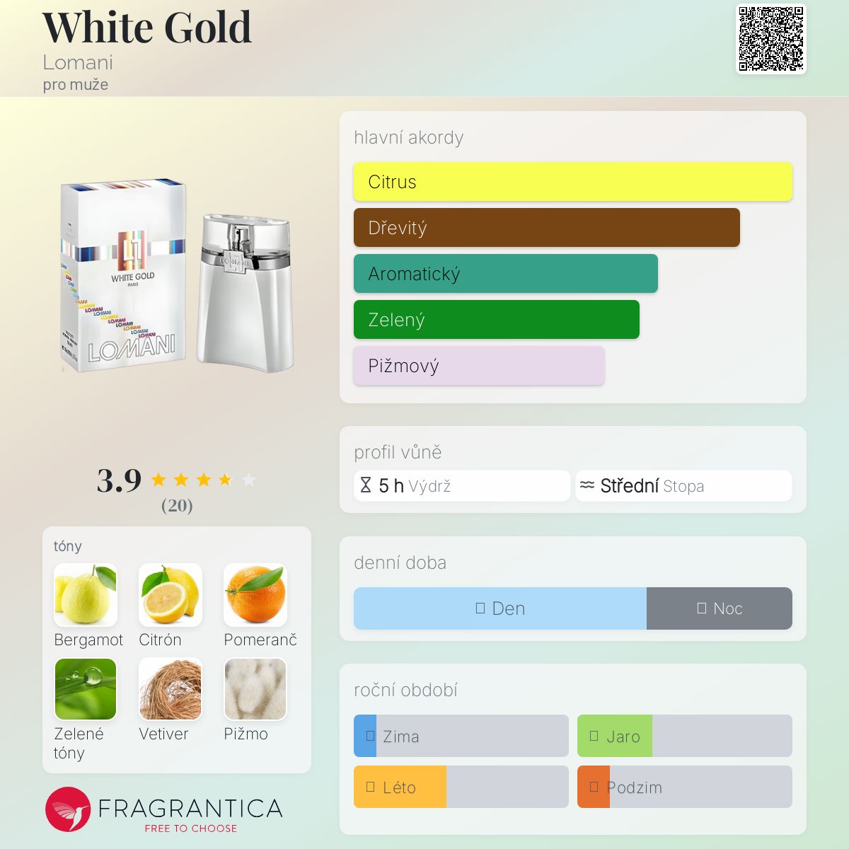 White Gold podle Lomani je Citrus Aromatic vůně pro muže. Vrchní tóny jsou Bergamot, Citrón, Pomeranč a Kardamom; střední tóny jsouBylinné tóny, Atlasový cedr a Ylang-Ylang ; základní tóny jsou Vetiver, Bílé pižmo a Dřevité tóny.