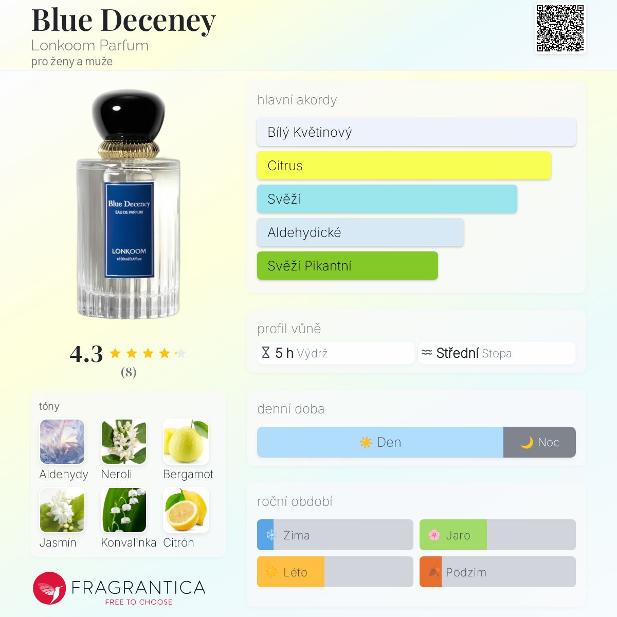 Blue Deceney podle Lonkoom Parfum je Floral Aldehyde vůně pro ženy a muže. Blue Deceney byl/a uveden/a v roce 2023. Vrchní tóny jsou Aldehydy, Neroli, Bergamot, Citrón a Ylang-Ylang; střední tóny jsouJasmín, Konvalinka, Orris, Kosatec a Růže ; základní tóny jsou Pižmo, Jantar (ambra), Santalové dřevo, Pačuli a Vetiver.