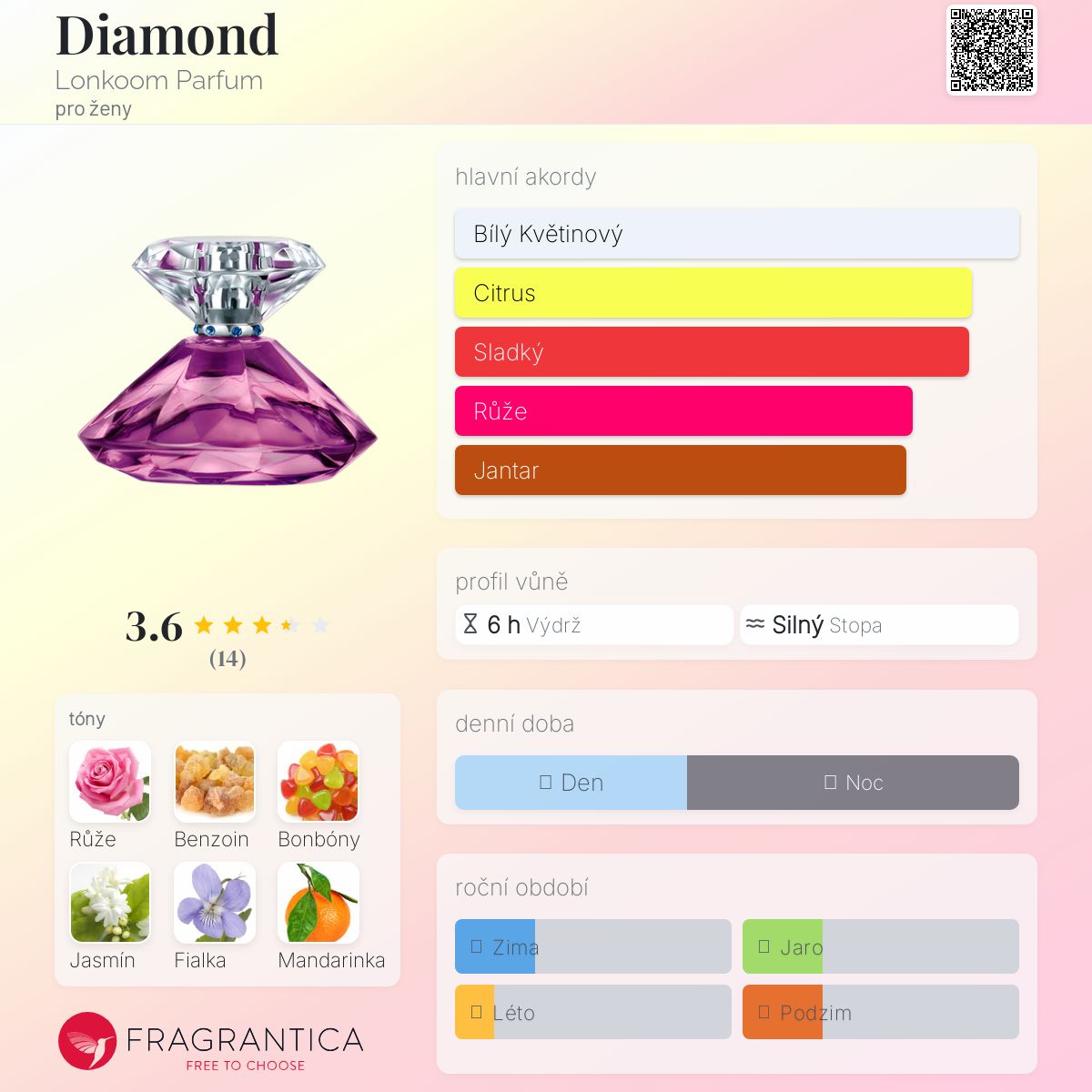 Diamond podle Lonkoom Parfum je Orientální Floral vůně pro ženy. Diamond byl/a uveden/a v roce 2015. Vrchní tóny jsou Mandarinka, Mandarinka, Mořské tóny a Ozonové tóny; střední tóny jsouRůže, Jasmín, Fialka a Konvalinka ; základní tóny jsou Benzoin, Sladké tóny, Pačuli a Pižmo.