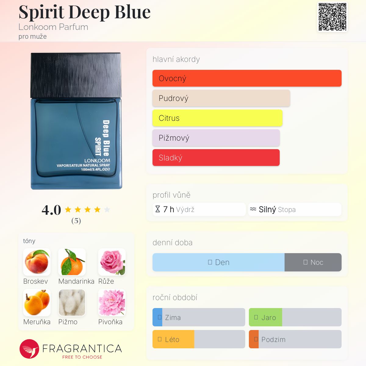 Spirit Deep Blue podle Lonkoom Parfum je Aromatic Fruity vůně pro muže. Spirit Deep Blue byl/a uveden/a v roce 2023. Vrchní tón je Mandarinka ; střední tóny jsouBroskev, Růže, Meruňka a Pivoňka ; základní tón je Pižmo.
