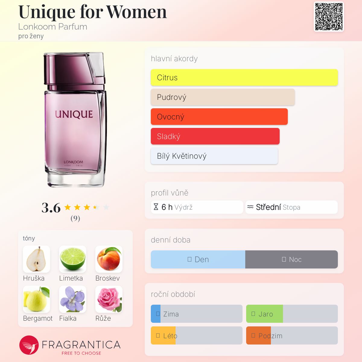 Unique for Women podle Lonkoom Parfum je Floral Fruity vůně pro ženy. Unique for Women byl/a uveden/a v roce 2017. Vrchní tóny jsou Hruška, Limetka, Broskev, Bergamot, Mandarinka a Aldehydy; střední tóny jsouFialka, Růže, Tuberóza a Pomerančový květ ; základní tóny jsou Jantar (ambra), Santalové dřevo, Vanilka a Pižmo.