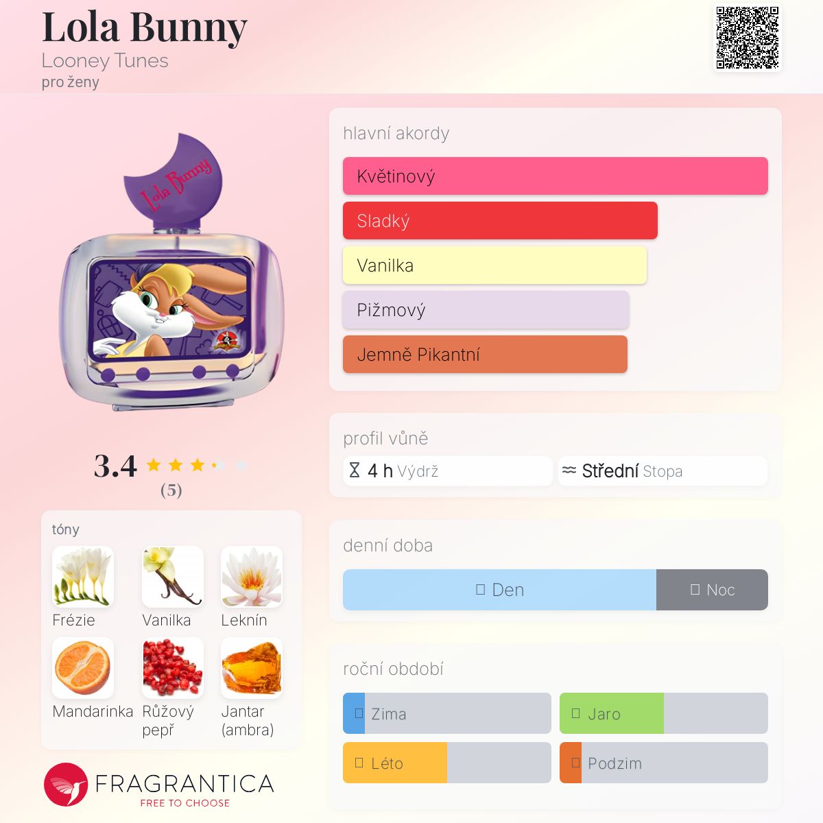 Lola Bunny podle Looney Tunes je Floral Fruity vůně pro ženy. Vrchní tóny jsou Mandarinka, Růžový pepř a Bílá hruška; střední tóny jsouFrézie, Leknín a Růžový jasmín ; základní tóny jsou Vanilkový květ, Jantar (ambra), Bílé dřevo a Pižmo.