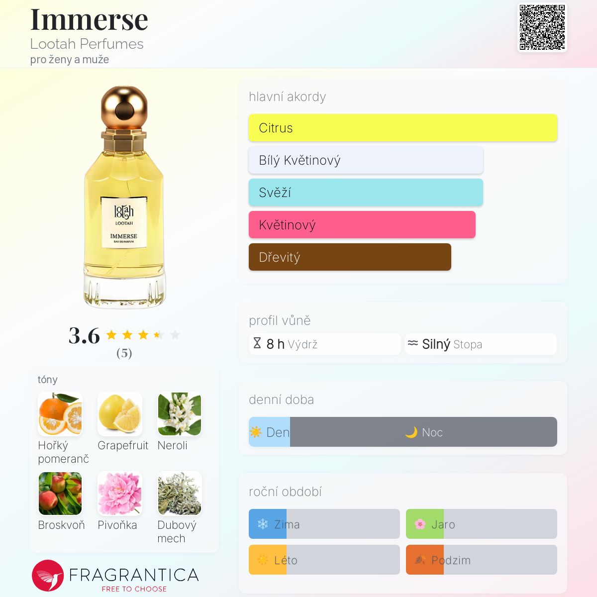 Immerse podle Lootah Perfumes je Chypre Floral vůně pro ženy a muže. Immerse byl/a uveden/a v roce 2018. Vrchní tóny jsou Hořký pomeranč, Grapefruit a Neroli; střední tóny jsouBroskvoň a Pivoňka ; základní tóny jsou Dubový mech, Jasmín a Jantar (ambra).