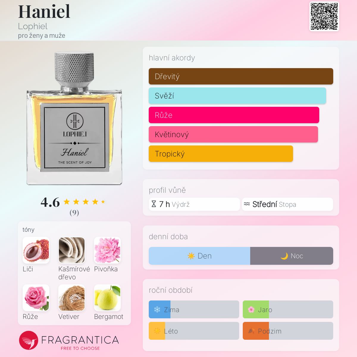 Haniel podle Lophiel je Floral Fruity vůně pro ženy a muže. Haniel byl/a uveden/a v roce 2022. "Nosem" za touto vůní je Sebastien Lacouture. Vrchní tóny jsou Liči, Bergamot a Maliny; střední tóny jsouPivoňka, Růže a Tahitská vanilka ; základní tóny jsou Kašmírové dřevo, Vetiver a Pižmo.