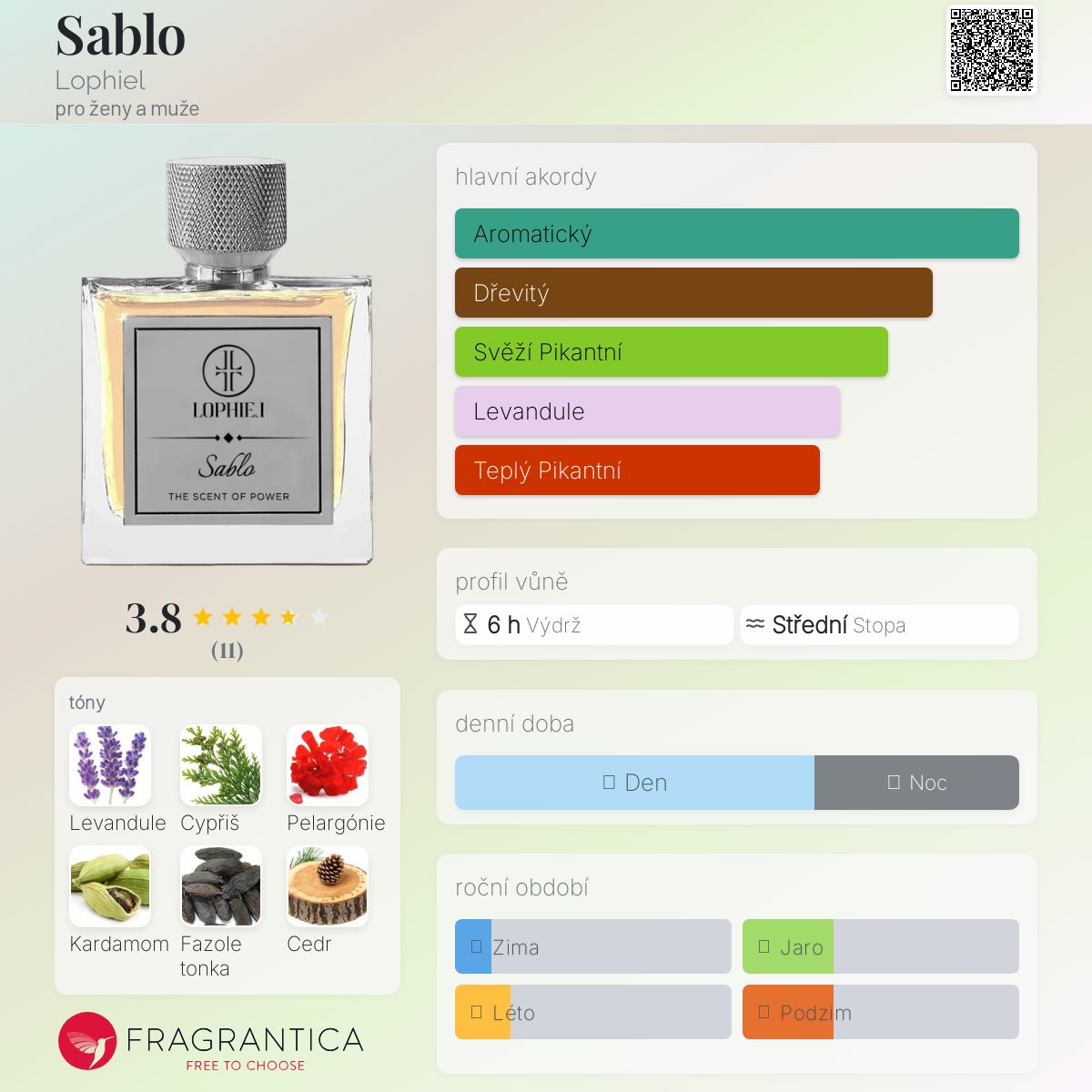 Sablo podle Lophiel je Woody Aromatic vůně pro ženy a muže. Sablo byl/a uveden/a v roce 2022. "Nosem" za touto vůní je Helene Vonesch. Vrchní tóny jsou Pelargónie, Kardamom a Mandarinka; střední tóny jsouLevandule, Cypřiš a Orris ; základní tóny jsou Fazole tonka, Cedr a Kůže.