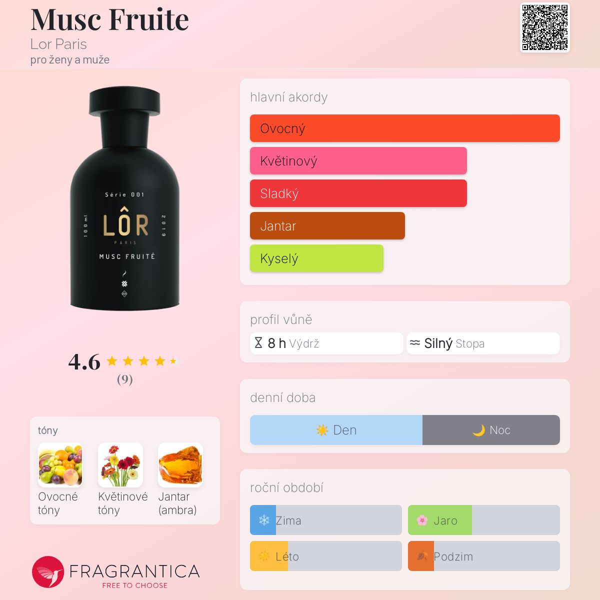 Musc Fruite podle Lor Paris je Floral Fruity vůně pro ženy a muže. Musc Fruite byl/a uveden/a v roce 2019. "Nosem" za touto vůní je Nathalie Feisthauer.