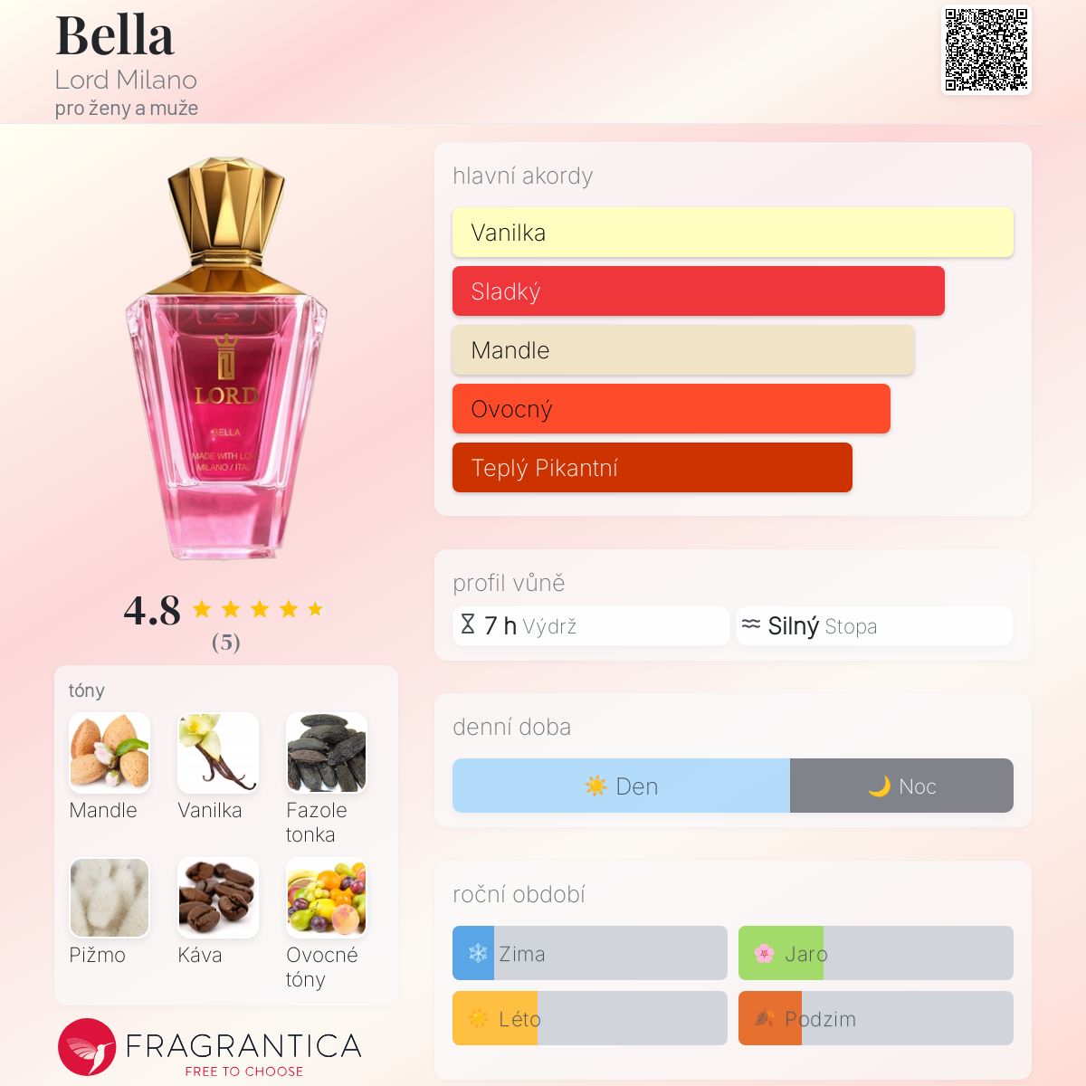 Bella podle Lord Milano je vůně pro ženy a muže. Bella byl/a uveden/a v roce 2022. "Nosem" za touto vůní je Michelle Moellhausen. Vrchní tóny jsou Mandle, Káva, Ovocné tóny a Koření; střední tóny jsouVanilka, Jasmín Sambac, Jantar (ambra) a Tuberóza ; základní tóny jsou Fazole tonka, Pižmo, Kakao a Vetiver.