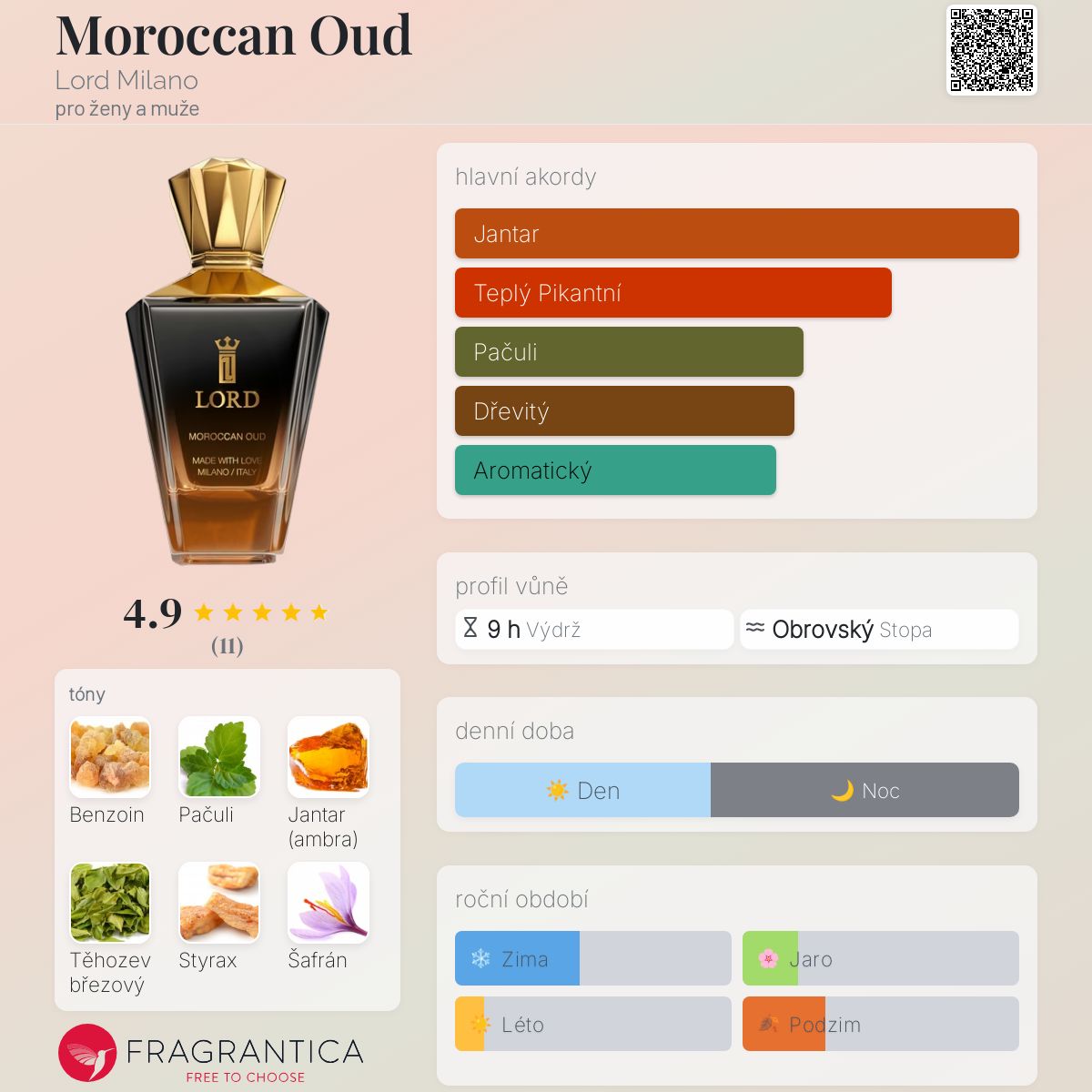 Moroccan Oud podle Lord Milano je Orientální Spicy vůně pro ženy a muže. Moroccan Oud byl/a uveden/a v roce 2019. "Nosem" za touto vůní je Nuria Du Chene De Vere. Vrchní tóny jsou Benzoin, Těhozev březový a Styrax; střední tóny jsouPačuli, Šafrán a Růže ; základní tóny jsou Jantar (ambra), Vetiver a Pižmo.