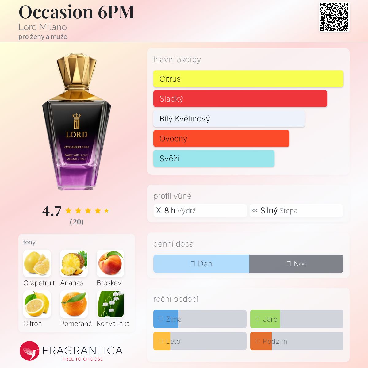 Occasion 6PM podle Lord Milano je Orientální Floral vůně pro ženy a muže. Occasion 6PM byl/a uveden/a v roce 2019. "Nosem" za touto vůní je Dominique Moellhausen. Vrchní tóny jsou Grapefruit, Ananas, Broskev, Citrón a Pomeranč; střední tóny jsouKonvalinka, Jasmín a Maltol ; základní tóny jsou Jantar (ambra), Santalové dřevo a Vanilka.