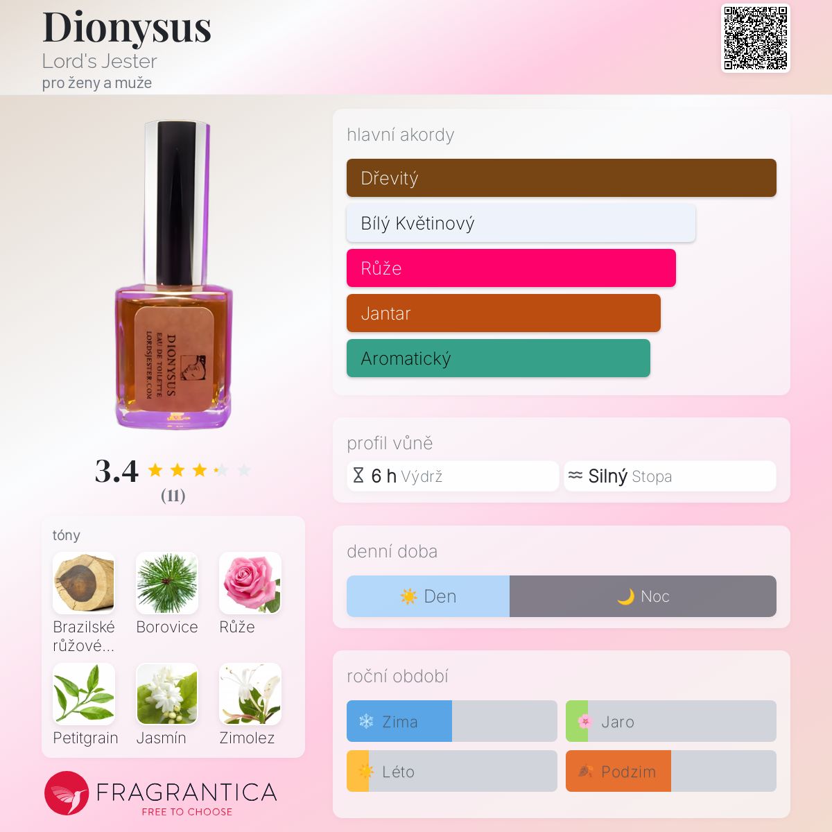 Dionysus podle Lord's Jester je Aromatic Spicy vůně pro ženy a muže. Dionysus byla spuštěna během 2000. "Nosem" za touto vůní je Adam Gottschalk. Vrchní tóny jsou Brazilské růžové dřevo, Petitgrain a Pepř; střední tóny jsouRůže, Jasmín, Zimolez, Taif růže, Tuberóza a Narcis ; základní tóny jsou Borovice, Benzoin, Daman, Ambrette (přírodní pižmo), Jantar (ambra) a Koňak.