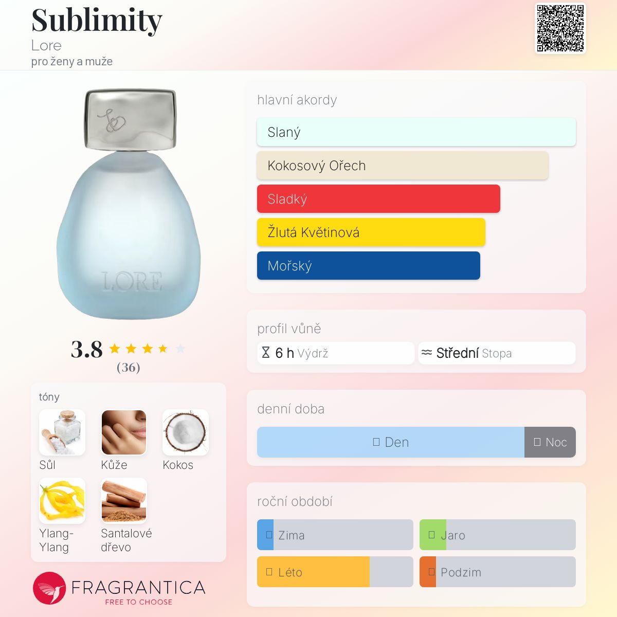 Sublimity podle Lore je Floral Woody Musk vůně pro ženy a muže. Toto je nová vůně. Sublimity byl/a uveden/a v roce 2025. "Nosem" za touto vůní je Jérôme Epinette. Vrchní tóny jsou Kokosový nektar a Ylang-Ylang; střední tóny jsouMořská sůl a Santalové dřevo ; základní tón je Kůže.