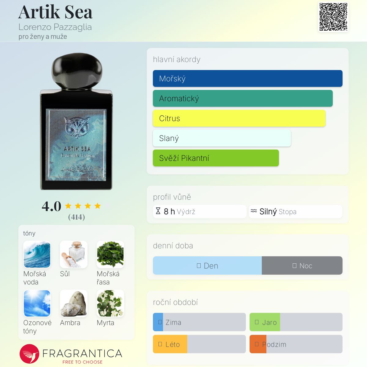 Artik Sea podle Lorenzo Pazzaglia je Woody Aquatic vůně pro ženy a muže. Artik Sea byl/a uveden/a v roce 2023. "Nosem" za touto vůní je Lorenzo Pazzaglia. Vrchní tóny jsou Mořské tóny, Ozonové tóny, Pelyněk, Bergamot, Limetka, Růžový grapefruit, Yuzu, Zelené tóny, Pomerančový květ, Citrón, Růžový pepř a Mandarinka; střední tóny jsouMořské tóny, Myrta, Bílé květy, Fík, Jasmín, Davana, Růže a Vistárie ; základní tóny jsou Sůl, Mořská řasa, Ambra, Dubový mech, Vzácné dřevo, Jantar (ambra), Ambrette (přírodní pižmo) a Pačuli.