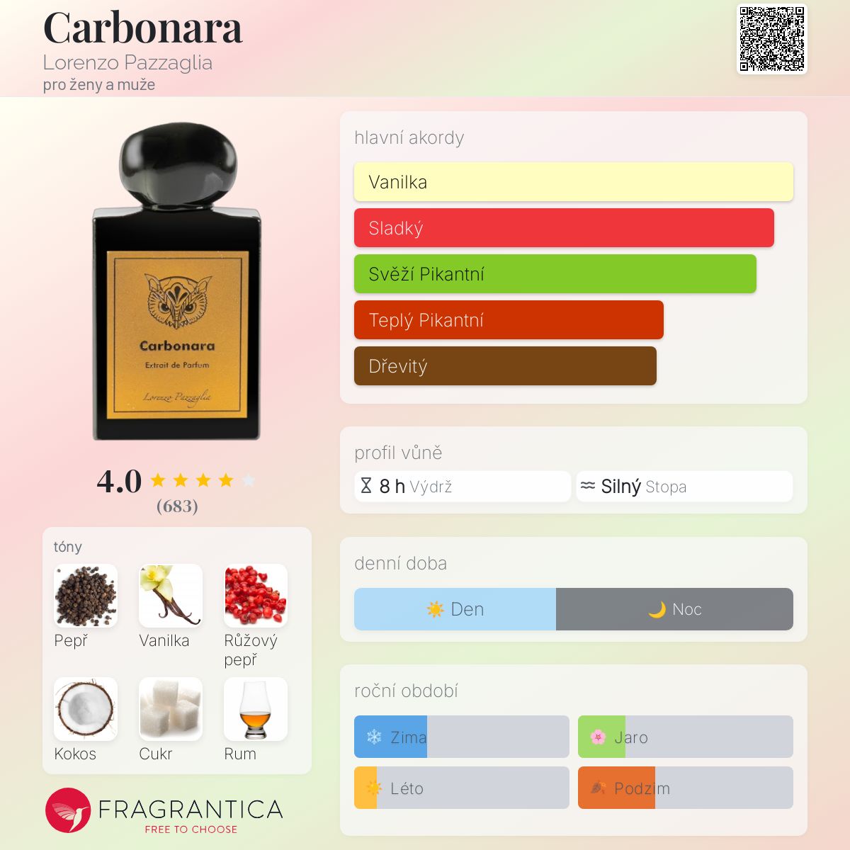 Carbonara podle Lorenzo Pazzaglia je vůně pro ženy a muže. Carbonara byl/a uveden/a v roce 2020. "Nosem" za touto vůní je Lorenzo Pazzaglia. Vrchní tóny jsou Černý pepř, Růžový pepř, Kokos, Kouř a Pryskyřice elemi; střední tóny jsouPepř, Rum, Davana a Jasmín ; základní tóny jsou Bourbonská vanilka, Cukrová třtina, Jantar (ambra), Santalové dřevo a Agarové dřevo (oud).