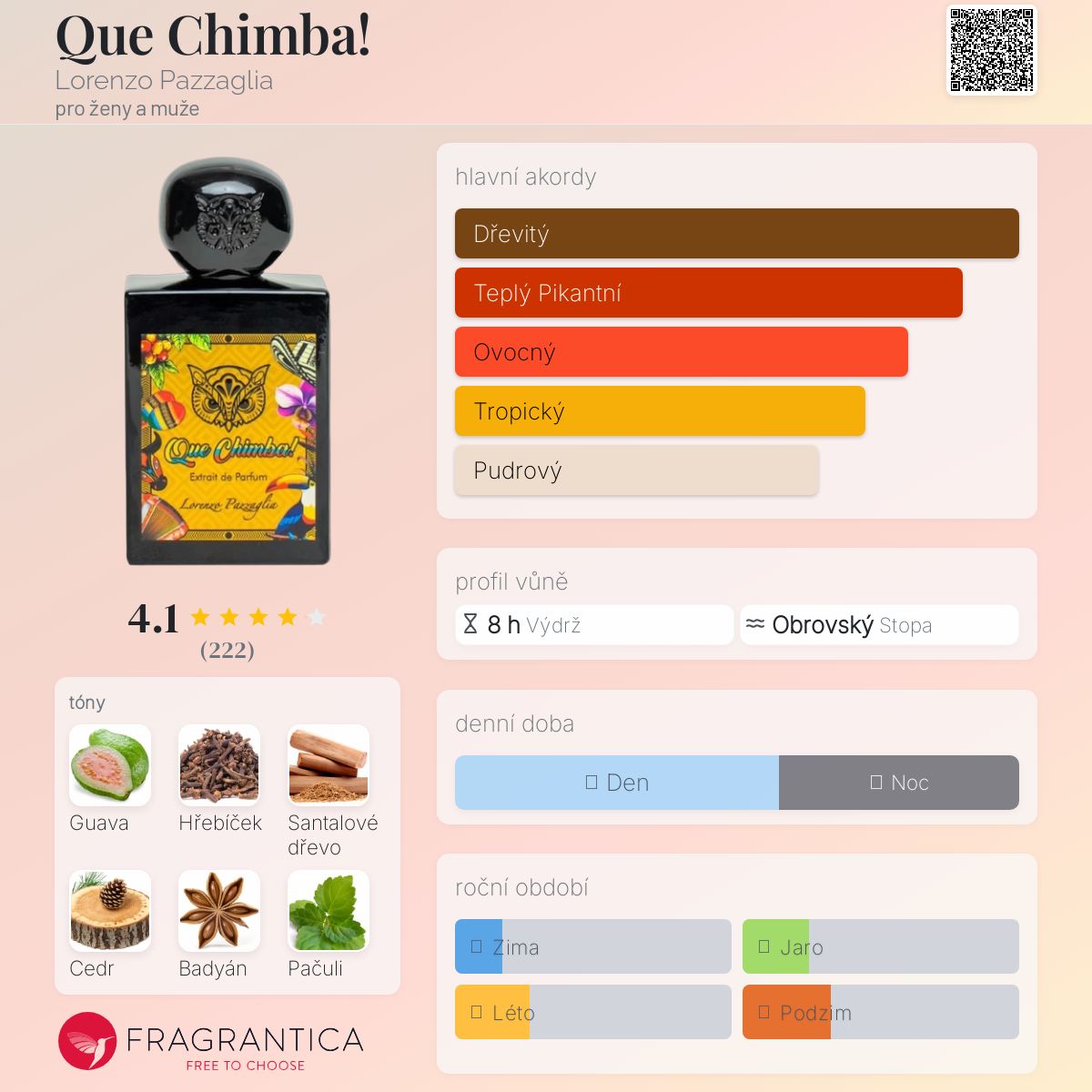 Que Chimba! podle Lorenzo Pazzaglia je Orientální Floral vůně pro ženy a muže. Toto je nová vůně. Que Chimba! byl/a uveden/a v roce 2025. "Nosem" za touto vůní je Lorenzo Pazzaglia. Vrchní tóny jsou Guava, Hřebíček, Badyán, Mučenka, Broskev, Skořice a Zázvor; střední tóny jsouFazole tonka, Tabák, Otočník, Orchidej a Damašská růže ; základní tóny jsou Santalové dřevo, Cedr, Pačuli, Vanilkový lusk, Benzoin, Ambra a Jantar (ambra).