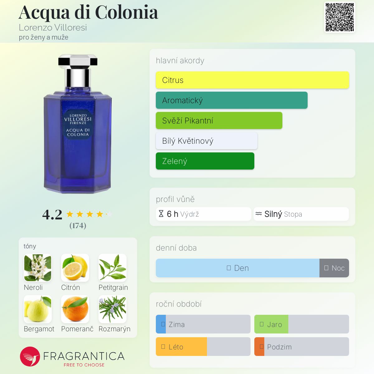 Acqua di Colonia podle Lorenzo Villoresi je Citrus Aromatic vůně pro ženy a muže. Acqua di Colonia byl/a uveden/a v roce 1996. "Nosem" za touto vůní je Lorenzo Villoresi. Vrchní tóny jsou Citron amalfi , Petitgrain, Bergamot, Pomeranč, Levandule a Elimi; střední tóny jsouNeroli, Šalvěj a Hřebíček ; základní tóny jsou Rozmarýn a Pižmo.