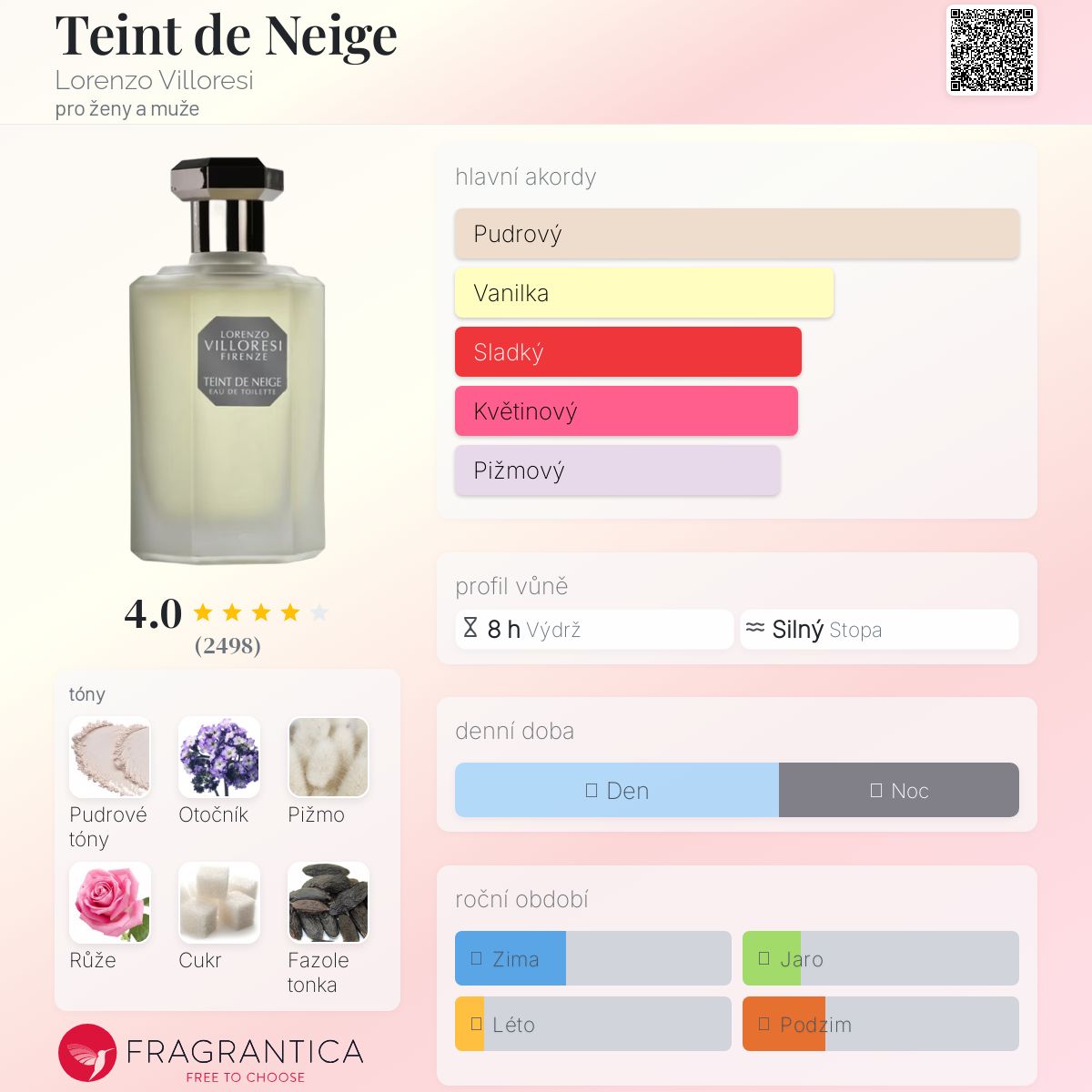 Teint de Neige podle Lorenzo Villoresi je Floral Woody Musk vůně pro ženy a muže. Teint de Neige byl/a uveden/a v roce 2000. "Nosem" za touto vůní je Lorenzo Villoresi. Vrchní tóny jsou Pudrové tóny, Růže, Ylang-Ylang a Jasmín; střední tóny jsouRůže, Fazole tonka, Květinové tóny a Jasmín ; základní tóny jsou Otočník, Pižmo, Růže, Cukr a Jasmín.