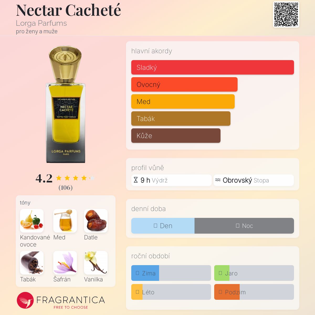 Nectar Cacheté podle Lorga Parfums je vůně pro ženy a muže. Nectar Cacheté byl/a uveden/a v roce 2021. Vrchní tóny jsou Kandované ovoce a Datle; střední tóny jsouMed, Šafrán a Jasmín ; základní tóny jsou Tabák, Vanilka a Kůže.