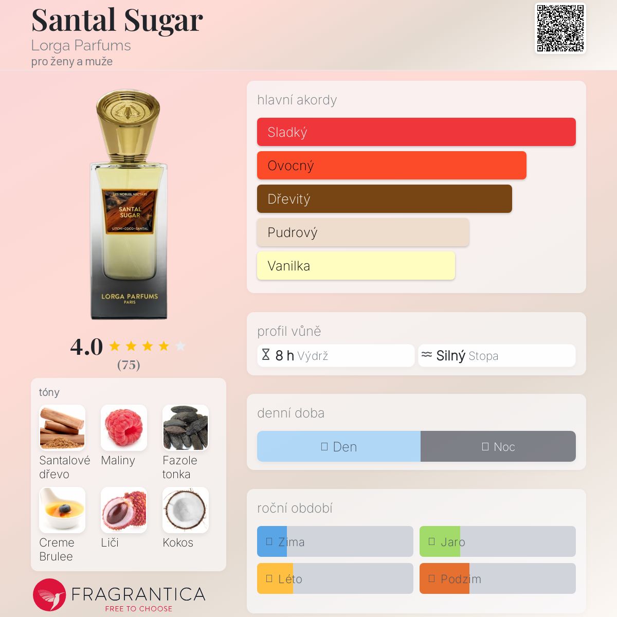Santal Sugar podle Lorga Parfums je vůně pro ženy a muže. Santal Sugar byl/a uveden/a v roce 2021. Vrchní tóny jsou Liči a Bergamot; střední tóny jsouMaliny, Kokos a Fialka ; základní tóny jsou Santalové dřevo, Fazole tonka a Creme Brulee.