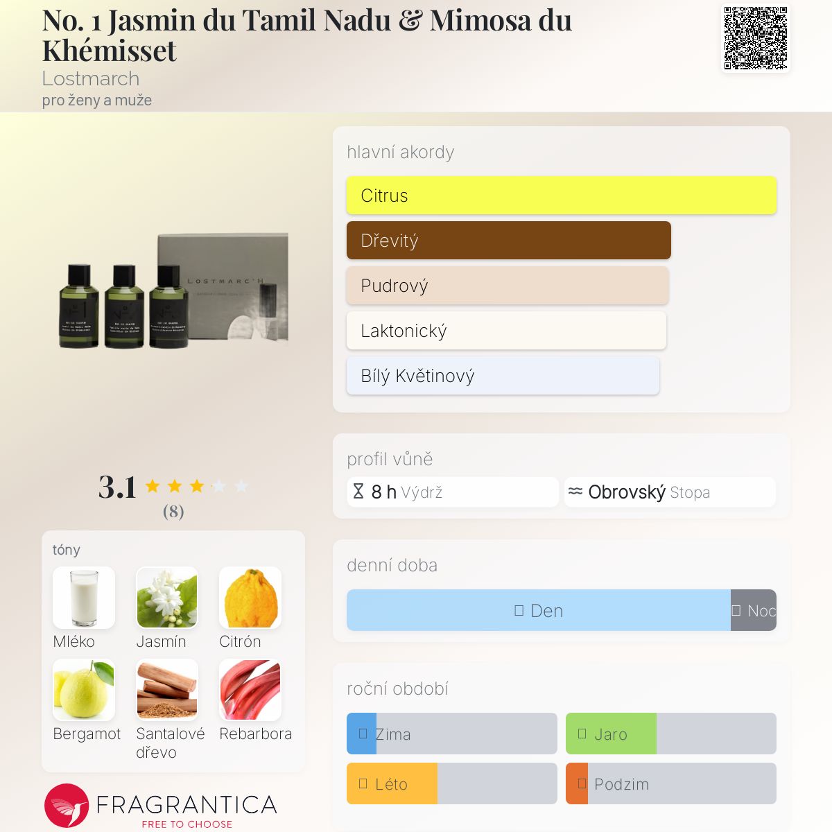 No. 1 Jasmin du Tamil Nadu & Mimosa du Khémisset podle Lostmarch je Floral vůně pro ženy a muže. No. 1 Jasmin du Tamil Nadu & Mimosa du Khémisset byl/a uveden/a v roce 2013.