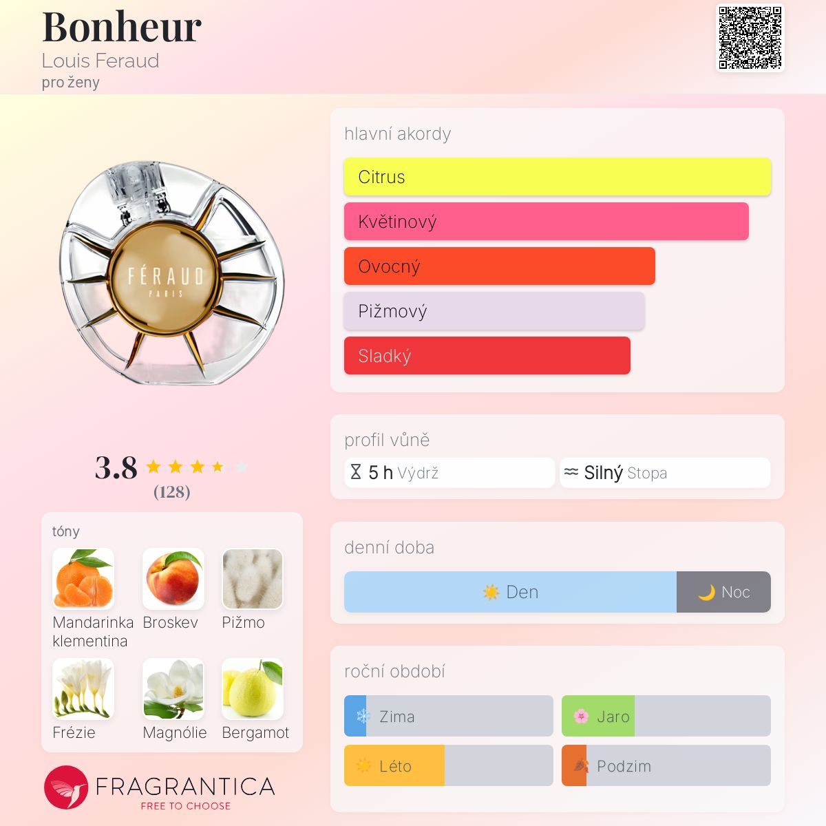 Bonheur podle Louis Feraud je Floral Fruity vůně pro ženy. Bonheur byl/a uveden/a v roce 2014. Vrchní tóny jsou Mandarinka klementina, Broskev a Bergamot; střední tóny jsouFrézie, Magnólie a Jasmín ; základní tóny jsou Bílé pižmo, Cedr a Santalové dřevo.