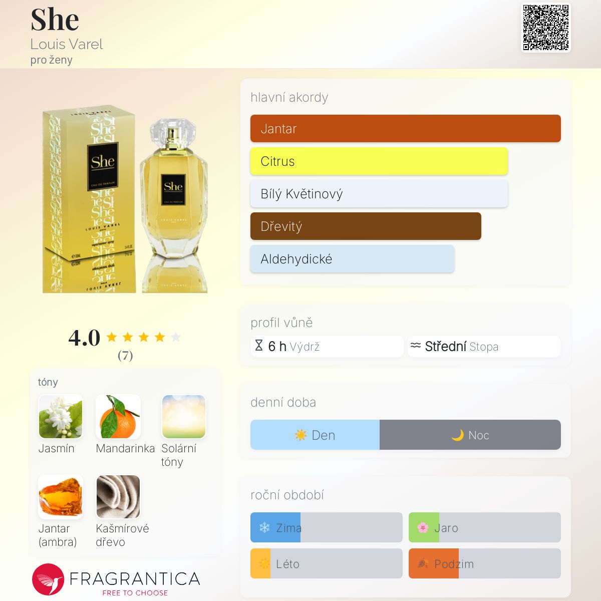 She podle Louis Varel je Floral vůně pro ženy. She byl/a uveden/a v roce 2019. Vrchní tóny jsou Jasmín a Mandarinka; střední tóny jsouJasmín a Solární tóny ; základní tóny jsou Bílý jantar (ambra) a Kašmírové dřevo.