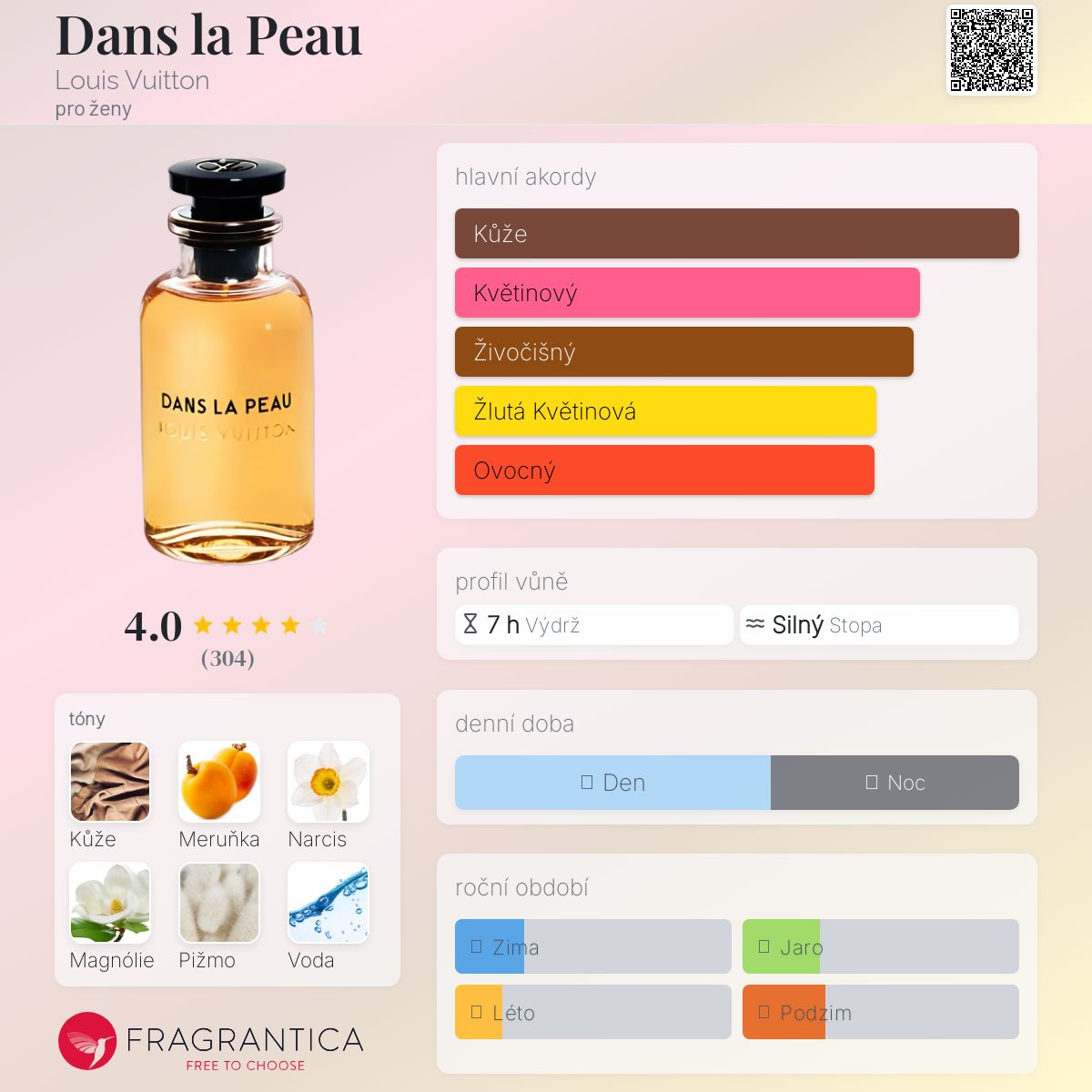 Dans la Peau podle Louis Vuitton je Leather vůně pro ženy. Dans la Peau byl/a uveden/a v roce 2016. "Nosem" za touto vůní je Jacques Cavallier Belletrud. Vrchní tóny jsou Meruňka a Vodní tóny; střední tóny jsouNarcis, Magnólie a Jasmín ; základní tóny jsou Kůže a Pižmo.