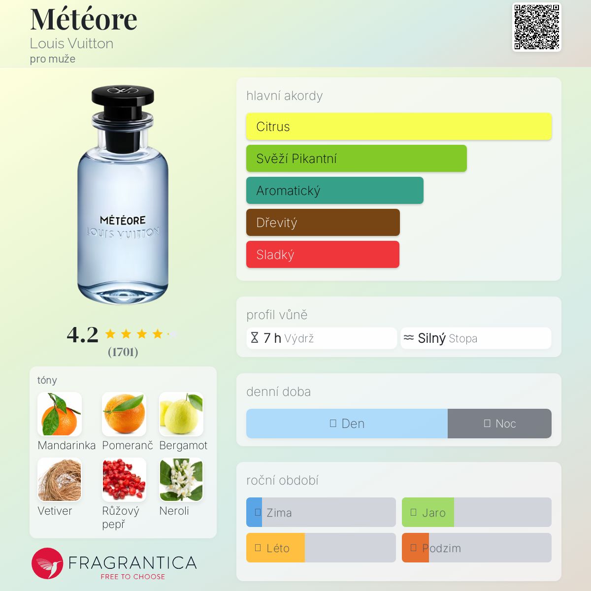 Météore podle Louis Vuitton je Citrus Aromatic vůně pro muže. Météore byl/a uveden/a v roce 2020. "Nosem" za touto vůní je Jacques Cavallier Belletrud. Vrchní tóny jsou Mandarinka, Sicilský pomeranč a Kalábrijský bergamot; střední tóny jsouRůžový pepř, Tuniské neroli, Pepř, Indonéský muškátový oříšek a Guatemalský kardamom ; základní tón je Java vetiverový olej.