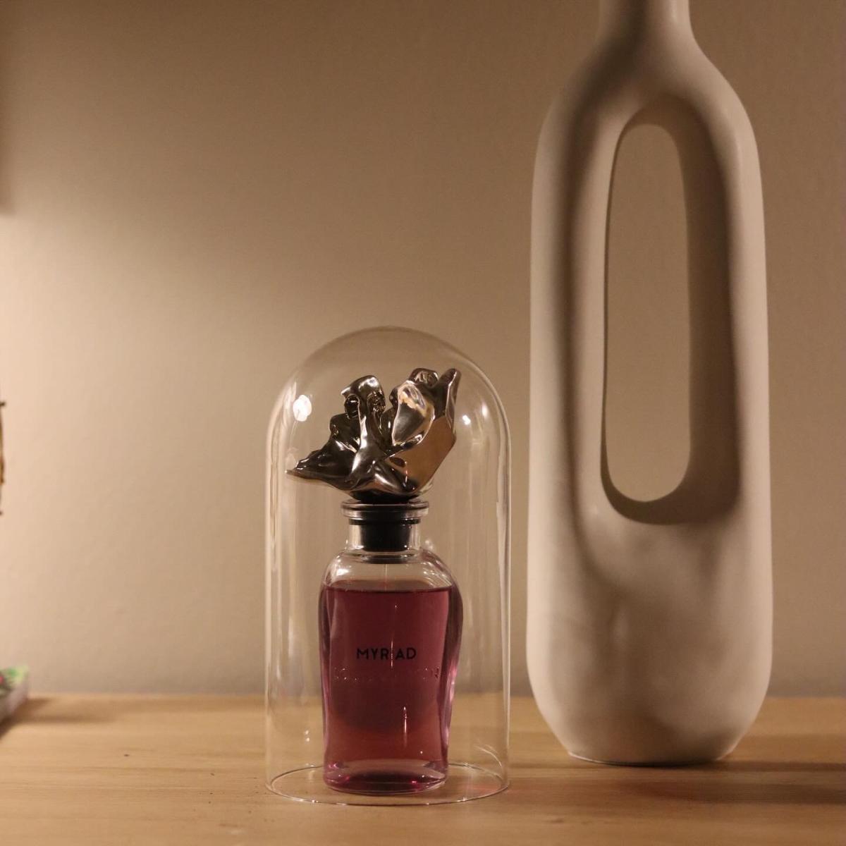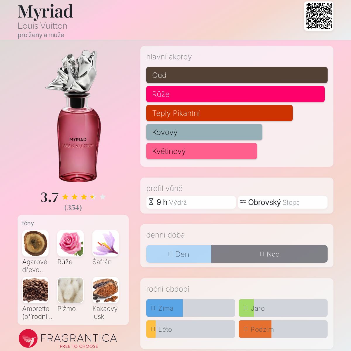 Myriad podle Louis Vuitton je Orientální Woody vůně pro ženy a muže. Toto je nová vůně. Myriad byl/a uveden/a v roce 2023. "Nosem" za touto vůní je Jacques Cavallier Belletrud. Vrchní tón je Šafrán ; střední tóny jsouBulharská růže a Travní růže ; základní tóny jsou Agarové dřevo (oud), Ambrette (přírodní pižmo), Bílé pižmo a Kakao.