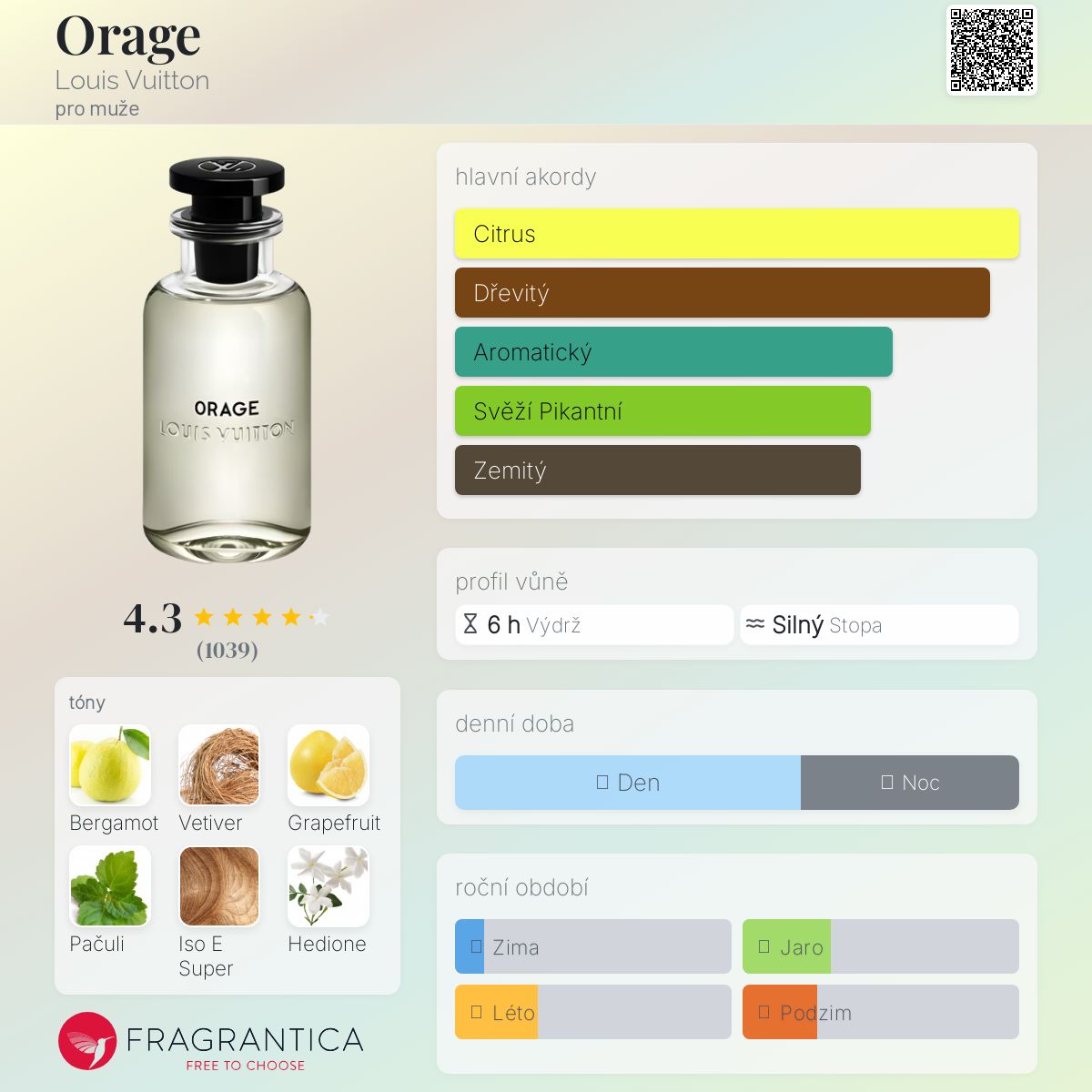 Orage podle Louis Vuitton je Woody vůně pro muže. Orage byl/a uveden/a v roce 2018. "Nosem" za touto vůní je Jacques Cavallier Belletrud. Vrchní tóny jsou Bergamot a Grapefruit; střední tóny jsouHedione, Kosatec a Pepř ; základní tóny jsou Java vetiverový olej, Pačuli, Iso E Super a Bílé pižmo.
