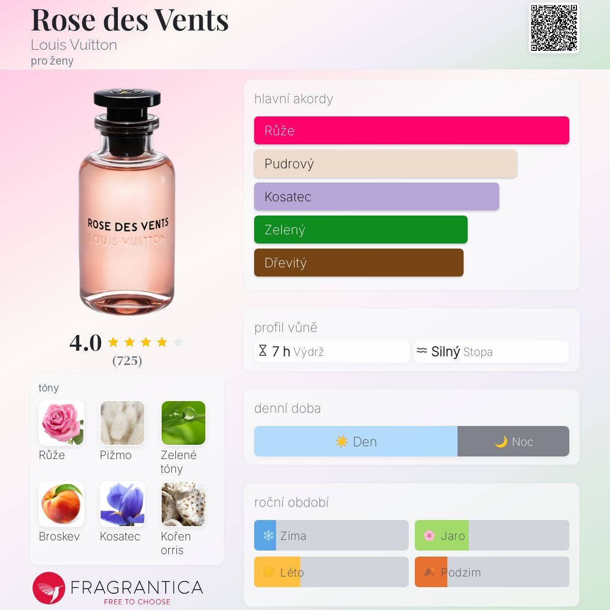 Rose des Vents podle Louis Vuitton je Floral vůně pro ženy. Rose des Vents byl/a uveden/a v roce 2016. "Nosem" za touto vůní je Jacques Cavallier Belletrud. Vrchní tóny jsou Broskev, Zelené tóny a Černý rybíz; střední tóny jsouRůže májová, Růže, Turecká růže a Kosatec ; základní tóny jsou Bílé pižmo, Kořen kosatce, Cedr, Fialkový list a Pepř.