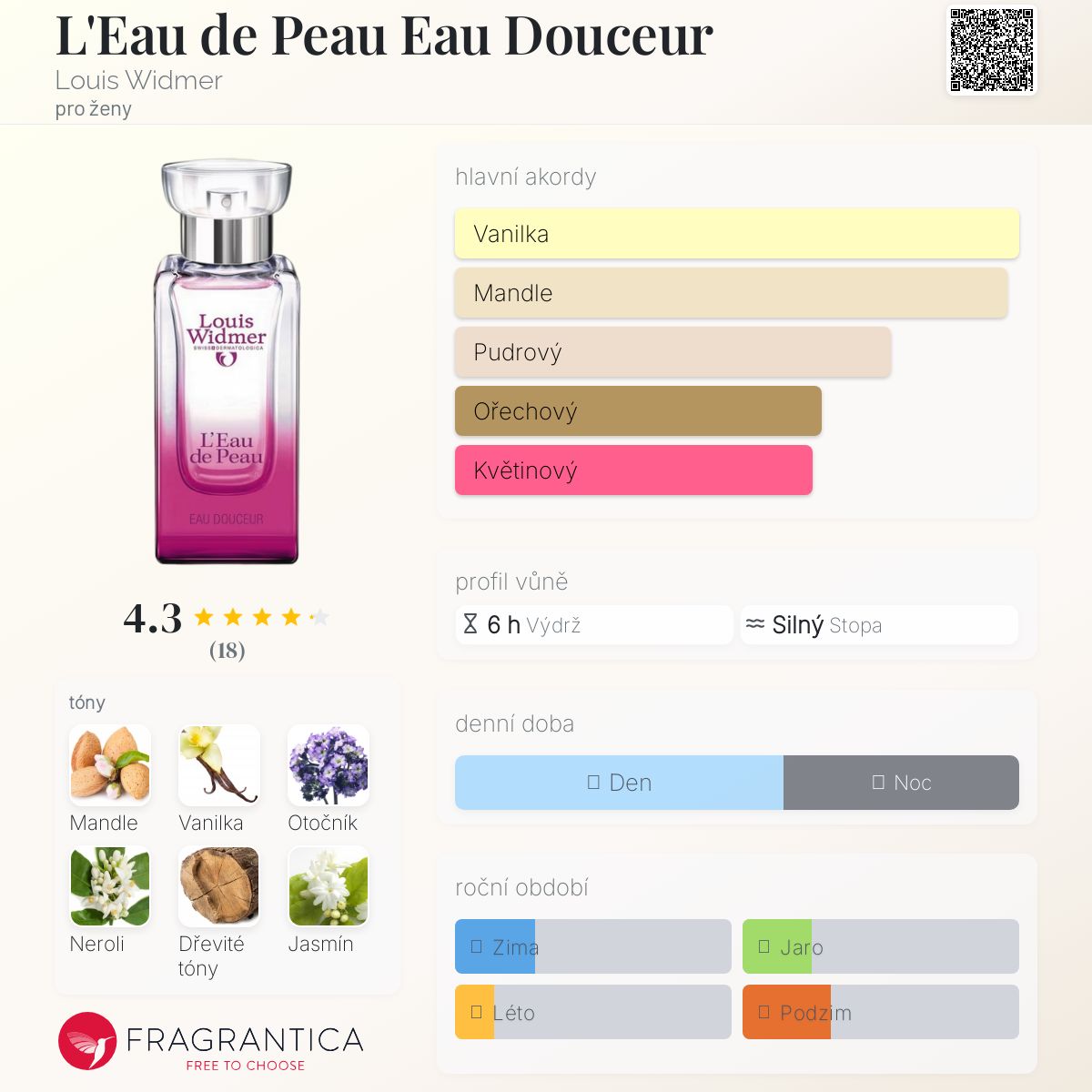 L'Eau de Peau Eau Douceur podle Louis Widmer je Floral Woody Musk vůně pro ženy. L'Eau de Peau Eau Douceur byl/a uveden/a v roce 2017. "Nosem" za touto vůní je Barbara Zoebelein. Vrchní tóny jsou Bílá mandle a Neroli; střední tóny jsouOtočník a Jasmín ; základní tóny jsou Vanilka a Dřevité tóny.