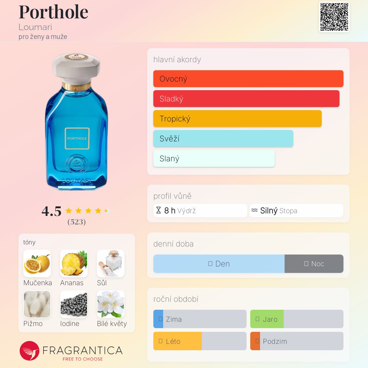 Porthole podle Loumari je Floral Fruity vůně pro ženy a muže. Porthole byl/a uveden/a v roce 2022. "Nosem" za touto vůní je Camille Chemardin. Vrchní tóny jsou Ananas, Mořská sůl, Jód a Bergamot; střední tóny jsouMučenka, Bílé květy a Zázvor ; základní tóny jsou Bílé pižmo, Karamel a Dřevité tóny.